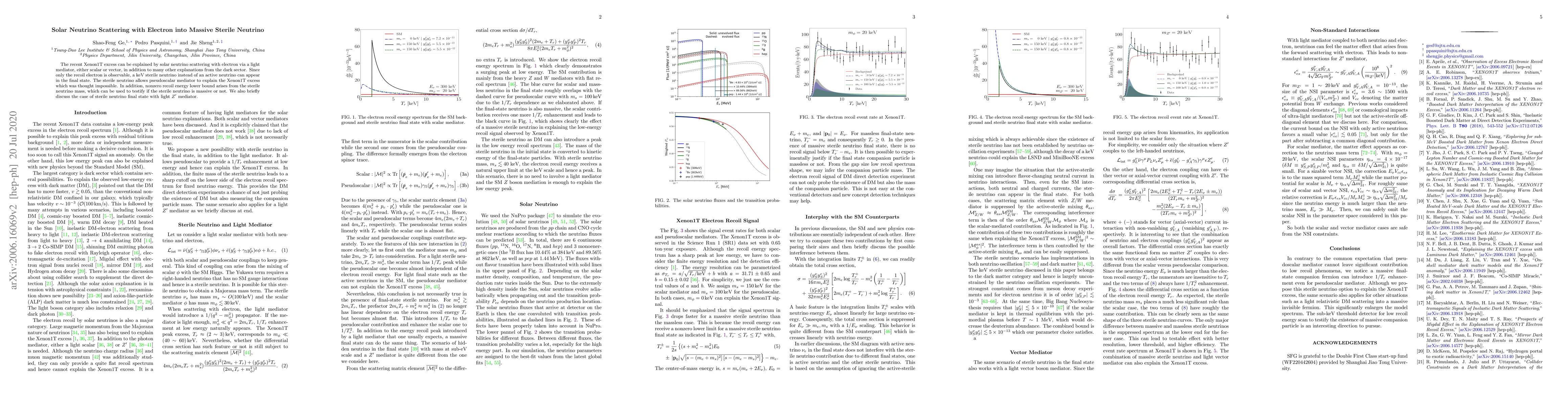 The recent Xenon1T excess can be explained by solar neutrino scattering with electron via a light mediator, either scalar or vector, in addition to many other explanations from the dark sector. Since only the recoil electron is observable, a keV sterile neutrino instead of an active neutrino can appear in the final state. The sterile neutrino allows pseudoscalar mediator to explain the Xenon1T excess which was thought impossible. In addition, nonzero recoil energy lower bound arises from the sterile neutrino mass, which can be used to testify if the sterile neutrino is massive or not. We also briefly discuss the case of a sterile neutrino final state with light $Z'$ mediator.
