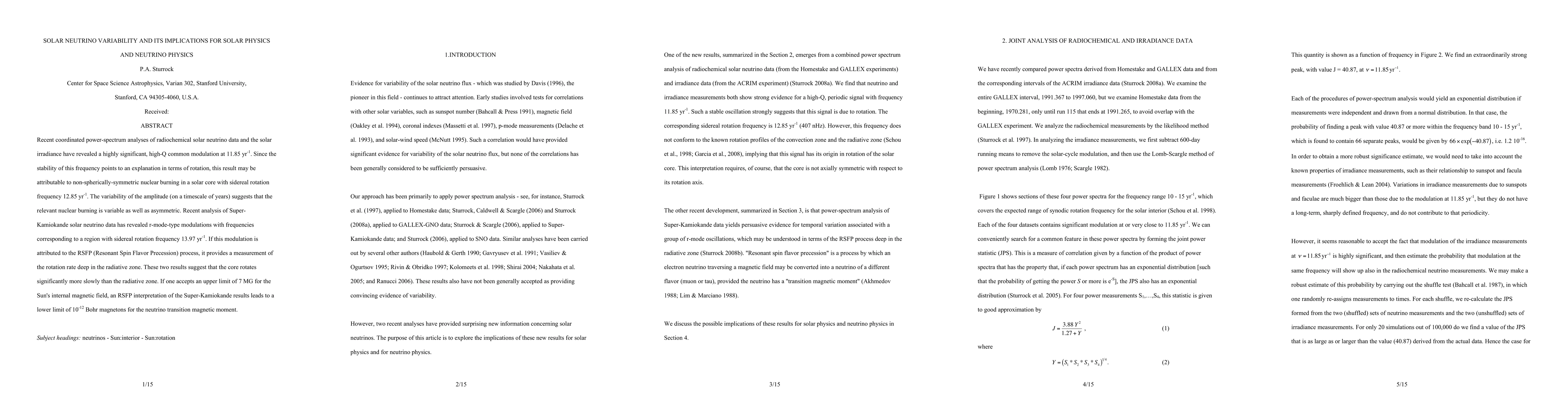 Recent coordinated power-spectrum analyses of radiochemical solar neutrino data and the solar irradiance have revealed a highly significant, high-Q common modulation at 11.85 yr-1. Since the stability of this frequency points to an explanation in terms of rotation, this result may be attributable to non-spherically-symmetric nuclear burning in a solar core with sidereal rotation frequency 12.85 yr-1. The variability of the amplitude (on a timescale of years) suggests that the relevant nuclear burning is variable as well as asymmetric. Recent analysis of Super-Kamiokande solar neutrino data has revealed r-mode-type modulations with frequencies corresponding to a region with sidereal rotation frequency 13.97 yr-1. If this modulation is attributed to the RSFP (Resonant Spin Flavor Precession) process, it provides a measurement of the rotation rate deep in the radiative zone. These two results suggest that the core rotates significantly more slowly than the radiative zone. If one accepts an upper limit of 7 MG for the Sun's internal magnetic field, an RSFP interpretation of the Super-Kamiokande results leads to a lower limit of 10-12 Bohr magnetons for the neutrino transition magnetic moment.