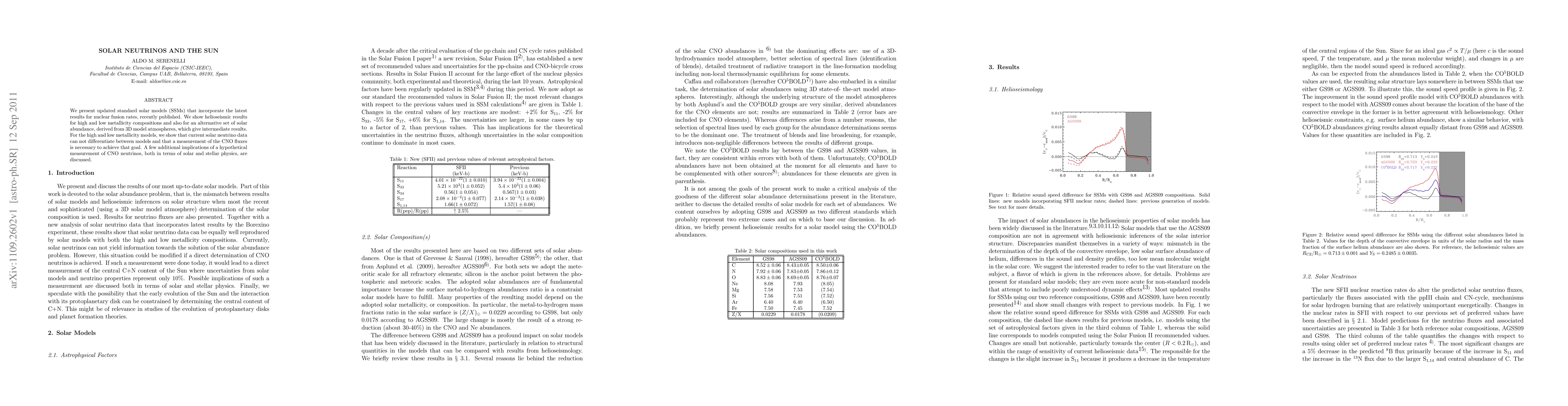 We present updated standard solar models (SSMs) that incorporate the latest results for nuclear fusion rates, recently published. We show helioseismic results for high and low metallicity compositions and also for an alternative set of solar abundance, derived from 3D model atmospheres, which give intermediate results. For the high and low metallicity models, we show that current solar neutrino data can not differentiate between models and that a measurement of the CNO fluxes is necessary to achieve that goal. A few additional implications of a hypothetical measurement of CNO neutrinos, both in terms of solar and stellar physics, are discussed.