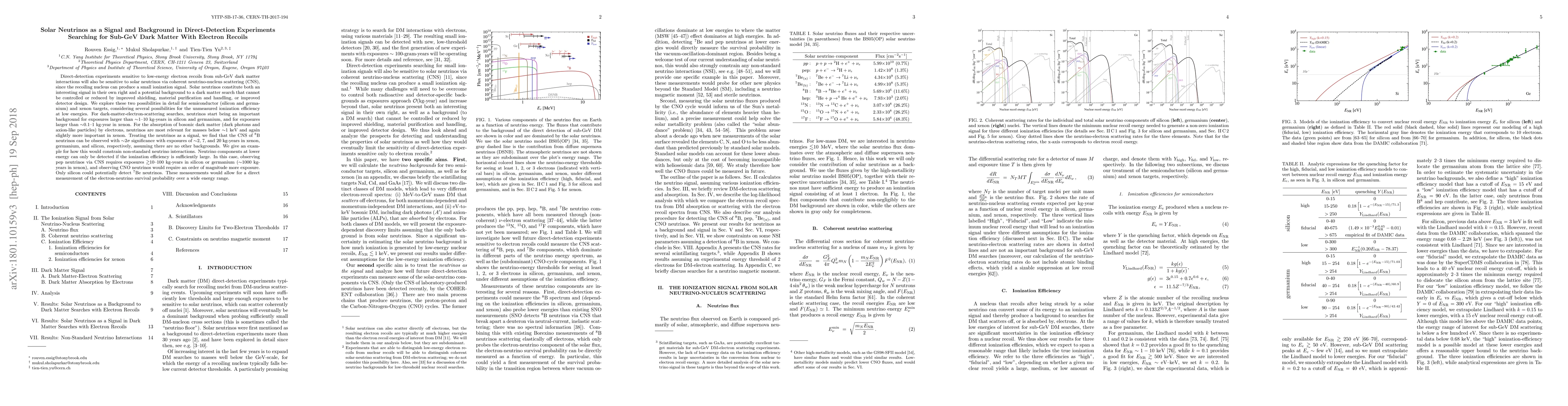 Direct-detection experiments sensitive to low-energy electron recoils from sub-GeV dark matter (DM) interactions will also be sensitive to solar neutrinos via coherent neutrino-nucleus scattering (CNS), since the recoiling nucleus can produce a small ionization signal. Solar neutrinos constitute both an interesting signal in their own right and a potential background to a DM search that cannot be controlled or reduced by improved shielding, material purification and handling, or improved detector design. We explore these two possibilities in detail for semiconductor (Si and Ge) and Xe targets, considering several possibilities for the unmeasured ionization efficiency at low energies. For DM-electron-scattering searches, neutrinos start being an important background for exposures larger than ~1-10 kg-years in Si and Ge, and for exposures larger than ~0.1-1 kg-year in Xe. For the absorption of bosonic DM (dark photons and axion-like particles) by electrons, neutrinos are most relevant for masses below ~1 keV and again slightly more important in Xe. Treating the neutrinos as a signal, we find that the CNS of B-8 neutrinos can be observed with ~2 sigma significance with exposures of ~2, 7, and 20 kg-years in Xe, Ge, and Si, respectively, assuming there are no other backgrounds. We give an example for how this would constrain non-standard neutrino interactions. Neutrino components at lower energy can only be detected if the ionization efficiency is sufficiently large. In this case, observing pep neutrinos via CNS requires exposures ~10-100 kg-years in Si or Ge (~1000 kg-years in Xe), and observing CNO neutrinos would require an order of magnitude more exposure. Only Si could potentially detect Be-7 neutrinos. These measurements would allow for a direct measurement of the electron-neutrino survival probability over a wide energy range.