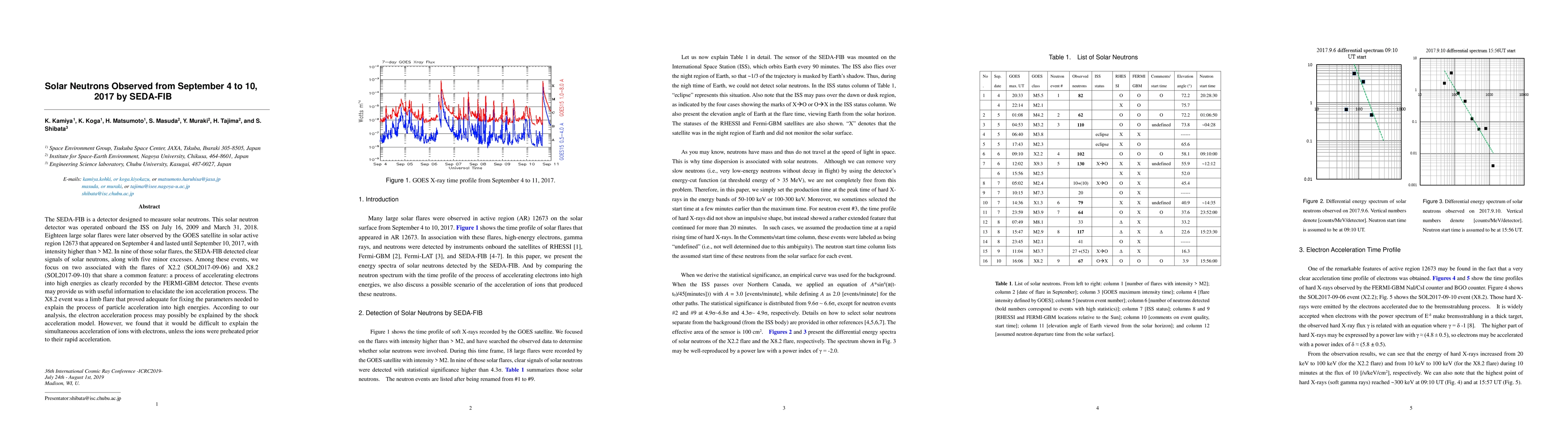 The SEDA-FIB is a detector designed to measure solar neutrons. This solar neutron detector was operated onboard the ISS on July 16, 2009 and March 31, 2018. Eighteen large solar flares were later observed by the GOES satellite in solar active region 12673 that appeared on September 4 and lasted until September 10, 2017, with intensity higher than > M2. In nine of those solar flares, the SEDA-FIB detected clear signals of solar neutrons, along with five minor excesses. Among these events, we focus on two associated with the flares of X2.2 (SOL2017-09-06) and X8.2 (SOL2017-09-10) that share a common feature: a process of accelerating electrons into high energies as clearly recorded by the FERMI-GBM detector. These events may provide us with useful information to elucidate the ion acceleration process. The X8.2 event was a limb flare that proved adequate for fixing the parameters needed to explain the process of particle acceleration into high energies. According to our analysis, the electron acceleration process may possibly be explained by the shock acceleration model. However, we found that it would be difficult to explain the simultaneous acceleration of ions with electrons, unless the ions were preheated prior to their rapid acceleration.