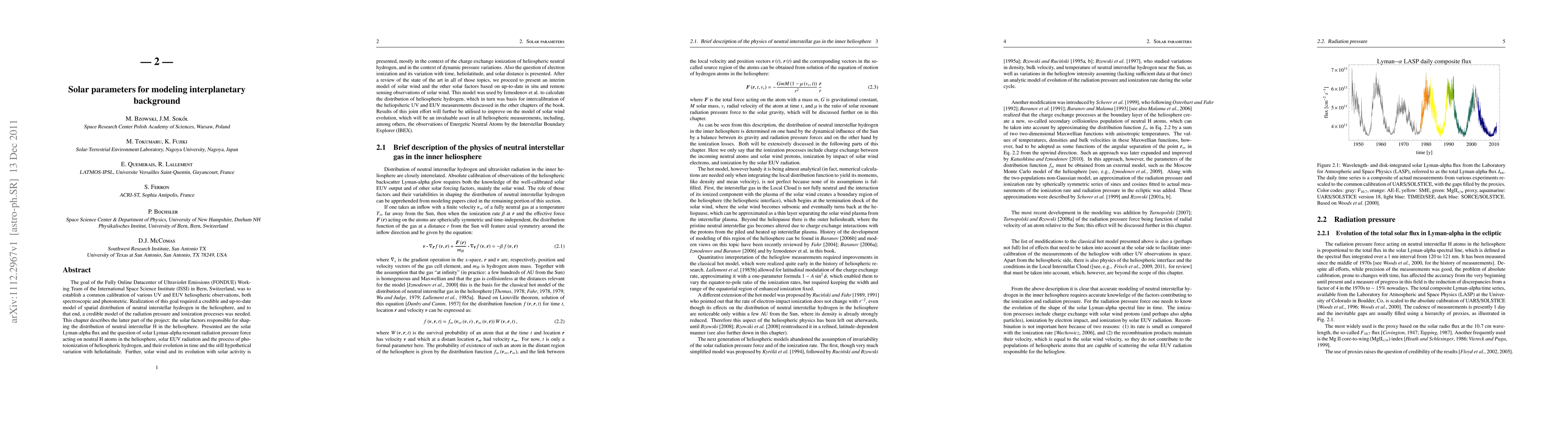 The goal of the Fully Online Datacenter of Ultraviolet Emissions (FONDUE) Working Team of the International Space Science Institute in Bern, Switzerland, was to establish a common calibration of various UV and EUV heliospheric observations, both spectroscopic and photometric. Realization of this goal required an up-to-date model of spatial distribution of neutral interstellar hydrogen in the heliosphere, and to that end, a credible model of the radiation pressure and ionization processes was needed. This chapter describes the solar factors shaping the distribution of neutral interstellar H in the heliosphere. Presented are the solar Lyman-alpha flux and the solar Lyman-alpha resonant radiation pressure force acting on neutral H atoms in the heliosphere, solar EUV radiation and the photoionization of heliospheric hydrogen, and their evolution in time and the still hypothetical variation with heliolatitude. Further, solar wind and its evolution with solar activity is presented in the context of the charge exchange ionization of heliospheric hydrogen, and in the context of dynamic pressure variations. Also the electron ionization and its variation with time, heliolatitude, and solar distance is presented. After a review of all of those topics, we present an interim model of solar wind and the other solar factors based on up-to-date in situ and remote sensing observations of solar wind. Results of this effort will further be utilised to improve on the model of solar wind evolution, which will be an invaluable asset in all heliospheric measurements, including, among others, the observations of Energetic Neutral Atoms by the Interstellar Boundary Explorer (IBEX).