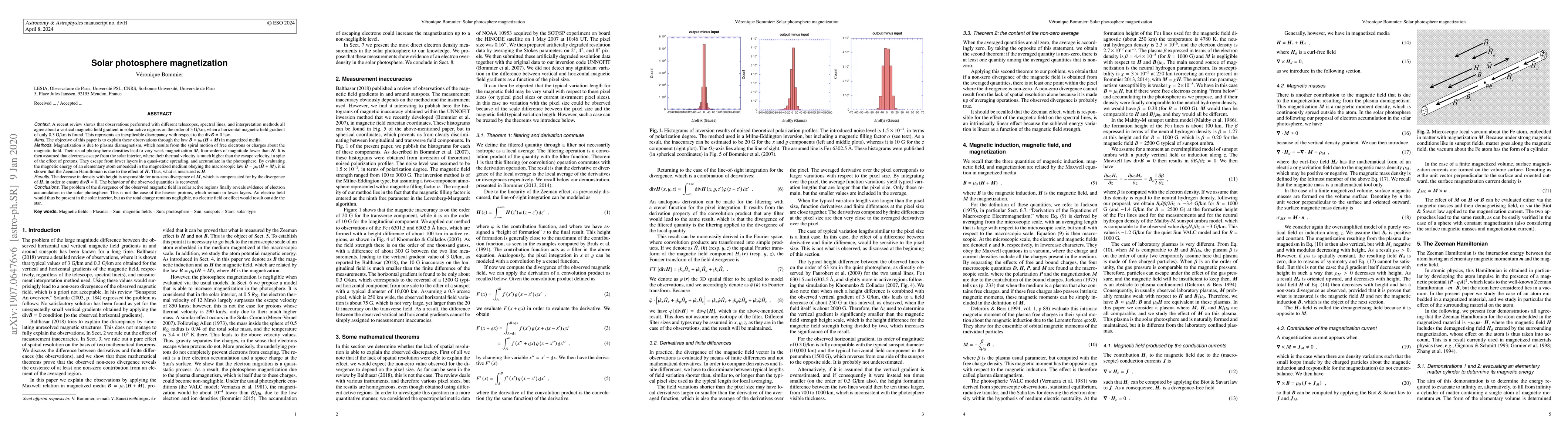 A recent review shows that observations performed with different telescopes, spectral lines, and interpretation methods all agree about a vertical magnetic field gradient in solar active regions on the order of 3 G/km, when a horizontal magnetic field gradient of only 0.3 G/km is found. This represents an inexplicable discrepancy with respect to the divB=0 law. The objective of this paper is to explain these observations through the law B=\mu_0(H+M) in magnetized media. Magnetization is due to plasma diamagnetism, which results from the spiral motion of free electrons or charges about the magnetic field. Their usual photospheric densities lead to very weak magnetization M, four orders of magnitude lower than H. It is then assumed that electrons escape from the solar interior, where their thermal velocity is much higher than the escape velocity, in spite of the effect of protons. They escape from lower layers in a quasi-static spreading, and accumulate in the photosphere. By evaluating the magnetic energy of an elementary atom embedded in the magnetized medium obeying the macroscopic law B=\mu_0(H+M), it is shown that the Zeeman Hamiltonian is due to the effect of H. Thus, what is measured is H. The decrease in density with height is responsible for non-zero divergence of M, which is compensated for by the divergence of H, in order to ensure divB=0. The behavior of the observed quantities is recovered. The problem of the divergence of the observed magnetic field in solar active regions finally reveals evidence of electron accumulation in the solar photosphere. This is not the case of the heavier protons, which remain in lower layers. An electric field would thus be present in the solar interior, but as the total charge remains negligible, no electric field or effect would result outside the star.