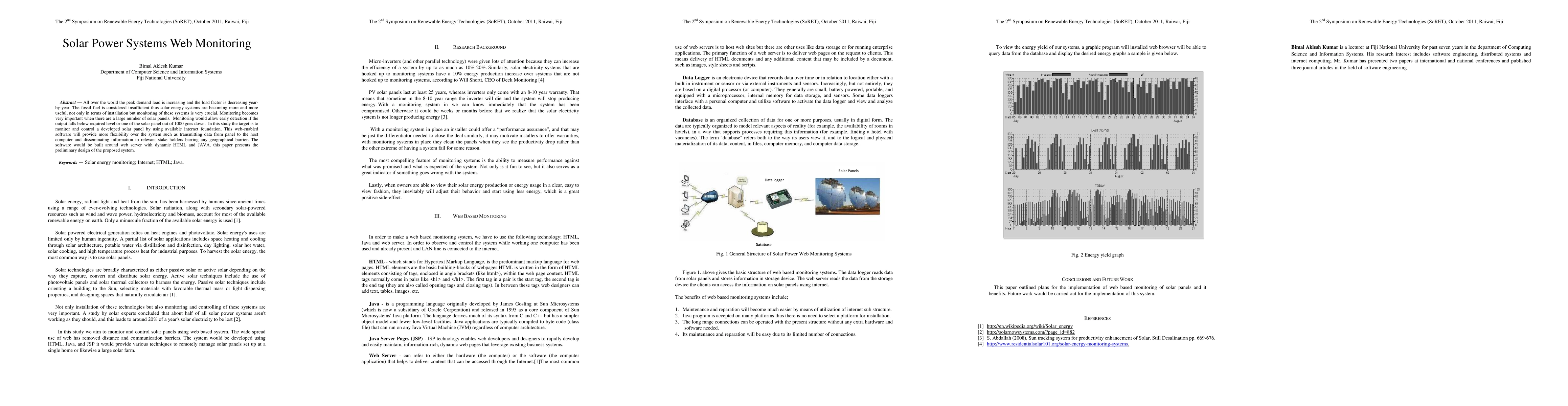 All over the world the peak demand load is increasing and the load factor is decreasing year-by-year. The fossil fuel is considered insufficient thus solar energy systems are becoming more and more useful, not only in terms of installation but monitoring of these systems is very crucial. Monitoring becomes very important when there are a large number of solar panels. Monitoring would allow early detection if the output falls below required level or one of the solar panel out of 1000 goes down. In this study the target is to monitor and control a developed solar panel by using available internet foundation. This web-enabled software will provide more flexibility over the system such as transmitting data from panel to the host computer and disseminating information to relevant stake holders barring any geographical barrier. The software would be built around web server with dynamic HTML and JAVA, this paper presents the preliminary design of the proposed system.