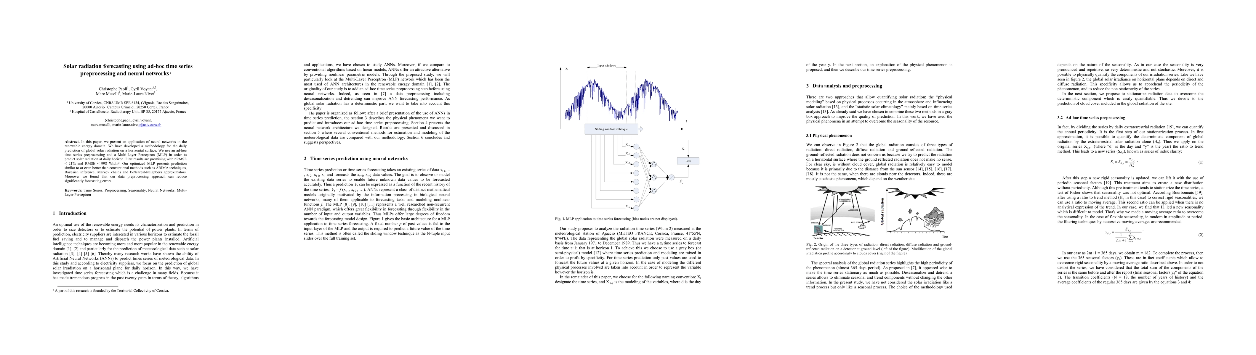 This paper proposes a neural network-based approach for daily solar radiation prediction using ad-hoc time series preprocessing and a Multi-Layer Perceptron (MLP). Initial results show promising accuracy with nRMSE < 21% and RMSE < 998 Wh/m², outperforming conventional methods.