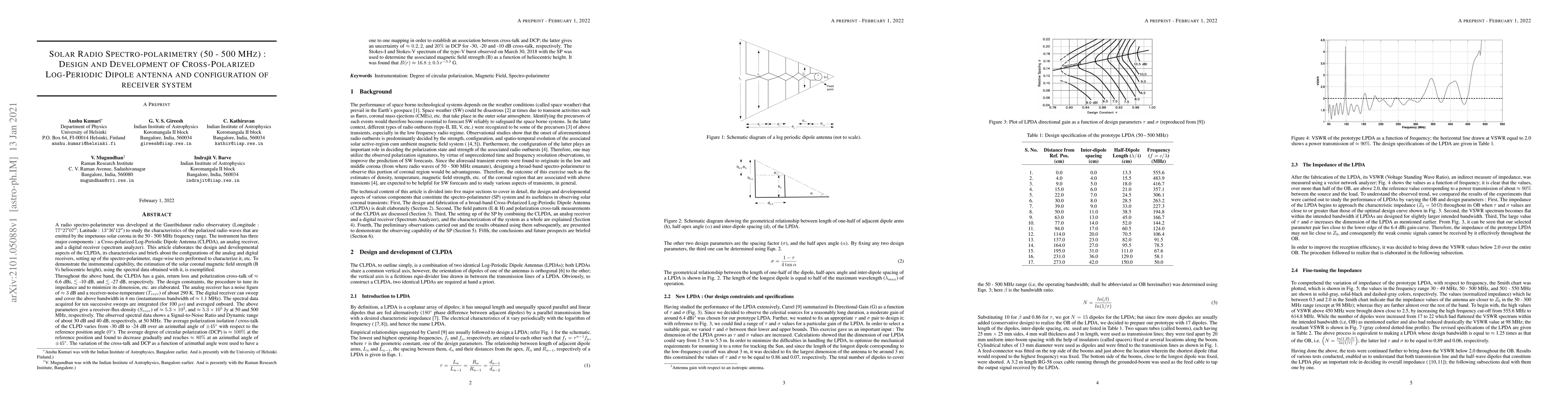A radio spectro-polarimeter was developed at the Gauribidanur radio observatory to study the characteristics of the polarized radio waves that are emitted by the impetuous solar corona in the 50 - 500 MHz frequency range. The instrument has three major components : a Cross-polarized Log-Periodic Dipole Antenna (CLPDA), an analog receiver, and a digital receiver (spectrum analyzer). This article elaborates the design and developmental aspects of the CLPDA, its characteristics and briefs about the configurations of the analog and digital receivers, setting up of the spectro-polarimeter, stage-wise tests performed to characterize it, etc. To demonstrate the instrumental capability, the estimation of the solar coronal magnetic field strength (B {\it Vs} heliocentric height), using the spectral data obtained with it, is exemplified. Throughout the above band, the CLPDA has a gain, return loss and polarization cross-talk of $\approx$ 6.6 dBi, $\lesssim$ -10 dB, and $\lesssim$ -27 dB, respectively. The design constraints, the procedure to tune its impedance and to minimize its dimension, etc. are elaborated. The analog receiver has a noise figure of $\approx 3$ dB and a receiver-noise-temperature ($T_{rcvr}$) of about 290 K. The receiver-flux-density ($S_{rcvr}$) is $\approx 5.3 \times 10^3 $, and $\approx 5.3 \times 10^5$ Jy at 50 and 500 MHz, respectively. The observed spectral data shows a Signal-to-Noise Ratio and Dynamic range of about 30 dB and 40 dB, respectively, at 50 MHz. The average polarization isolation / cross-talk of the CLPD varies from -30 dB to -24 dB over an azimuthal angle of $\pm 45^\circ$ with respect to the reference position angle ($0^\circ$). The average degree of circular polarization (DCP) is $\approx 100\%$ at the reference position and found to decrease gradually and reaches $\approx 80\%$ at an azimuthal angle of $\pm 45^\circ$.