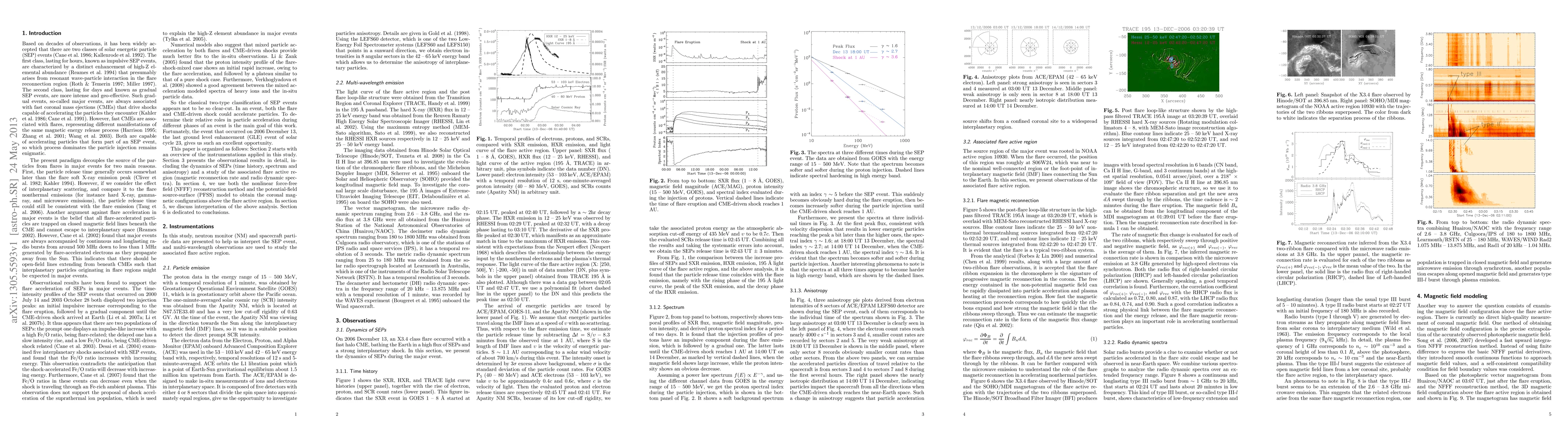 An X3.4 solar flare and a fast halo coronal mass ejection (CME) occurred on 2006 December 13, accompanied by a high flux of energetic particles recorded both in near-Earth space and at ground level. Our purpose is to provide evidence of flare acceleration in a major solar energetic particle (SEP) event. We first present observations from ACE/EPAM, GOES, and the Apatity neutron monitor. It is found that the initial particle release time coincides with the flare emission and that the spectrum becomes softer and the anisotropy becomes weaker during particle injection, indicating that the acceleration source changes from a confined coronal site to a widespread interplanetary CME-driven shock. We then describe a comprehensive study of the associated flare active region. By use of imaging data from HINODE/SOT and SOHO/MDI magnetogram, we infer the flare magnetic reconnection rate in the form of the magnetic flux change rate. This correlates in time with the microwave emission, indicating a physical link between the flare magnetic reconnection and the acceleration of nonthermal particles. Combining radio spectrograph data from Huairou/NOAC, Culgoora/IPS, Learmonth/RSTN, and WAVES/WIND leads to a continuous and longlasting radio burst extending from a few GHz down to several kHz. Based on the photospheric vector magnetogram from Huairou/NOAC and the nonlinear force free field (NFFF) reconstruction method, we derive the 3D magnetic field configuration shortly after the eruption. Furthermore, we also compute coronal field lines extending to a few solar radii using a potential-field source-surface (PFSS) model. Both the so-called type III-l burst and the magnetic field configuration suggest that open-field lines extend from the flare active region into interplanetary space, allowing the accelerated and charged particles escape.