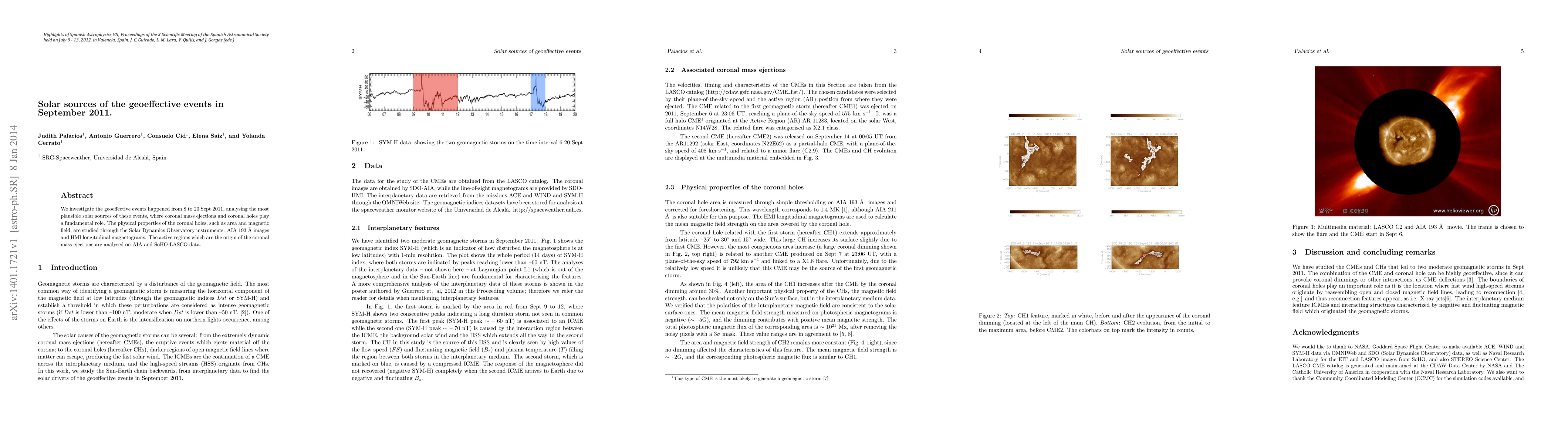 We investigate the geoeffective events happened from 8 to 20 Sept 2011, analysing the most plausible solar sources of these events, where coronal mass ejections and coronal holes play a fundamental role. The physical properties of the coronal holes, such as area and magnetic field, are studied through the Solar Dynamics Observatory instruments: AIA 193 {\AA} images and HMI longitudinal magnetograms. The active regions which are the origin of the coronal mass ejections are analysed in AIA and SoHO-LASCO data.