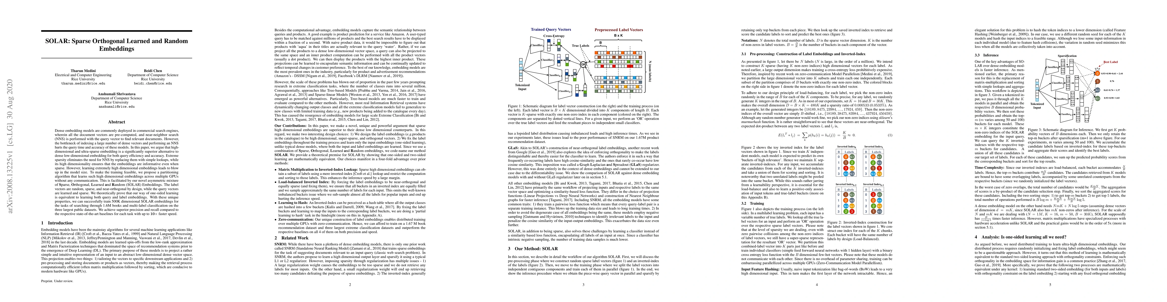 Dense embedding models are commonly deployed in commercial search engines, wherein all the document vectors are pre-computed, and near-neighbor search (NNS) is performed with the query vector to find relevant documents. However, the bottleneck of indexing a large number of dense vectors and performing an NNS hurts the query time and accuracy of these models. In this paper, we argue that high-dimensional and ultra-sparse embedding is a significantly superior alternative to dense low-dimensional embedding for both query efficiency and accuracy. Extreme sparsity eliminates the need for NNS by replacing them with simple lookups, while its high dimensionality ensures that the embeddings are informative even when sparse. However, learning extremely high dimensional embeddings leads to blow up in the model size. To make the training feasible, we propose a partitioning algorithm that learns such high dimensional embeddings across multiple GPUs without any communication. This is facilitated by our novel asymmetric mixture of Sparse, Orthogonal, Learned and Random (SOLAR) Embeddings. The label vectors are random, sparse, and near-orthogonal by design, while the query vectors are learned and sparse. We theoretically prove that our way of one-sided learning is equivalent to learning both query and label embeddings. With these unique properties, we can successfully train 500K dimensional SOLAR embeddings for the tasks of searching through 1.6M books and multi-label classification on the three largest public datasets. We achieve superior precision and recall compared to the respective state-of-the-art baselines for each of the tasks with up to 10 times faster speed.
