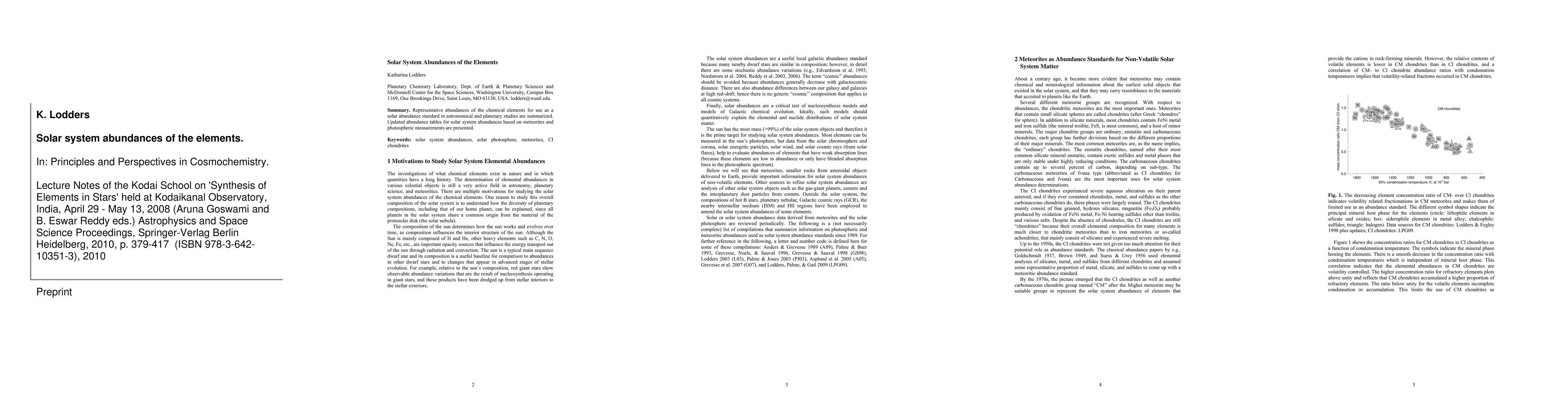 This paper provides updated abundance tables for chemical elements in the solar system, serving as a standard for astronomical and planetary studies. It compiles representative abundances based on meteorites and photospheric measurements.