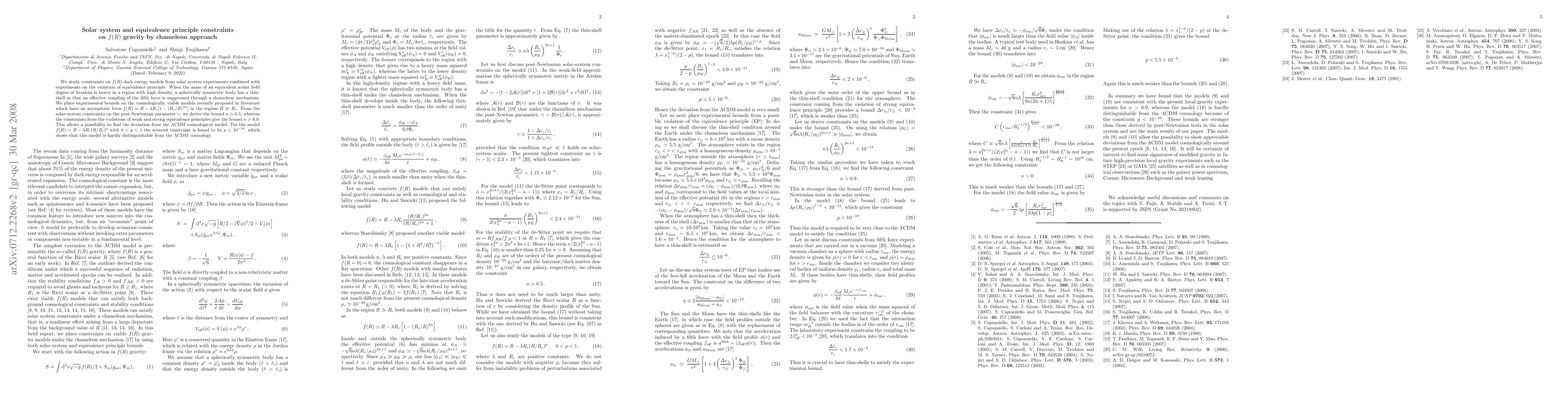 This paper investigates constraints on f(R) dark energy models using solar system experiments and tests for equivalence principle violations. The study finds that the chameleon mechanism suppresses fifth force coupling in high-density regions, leading to experimental bounds on the models, with n>0.5 from solar-system tests and n>0.9 from equivalence principle tests, potentially revealing deviations from the LambdaCDM model.