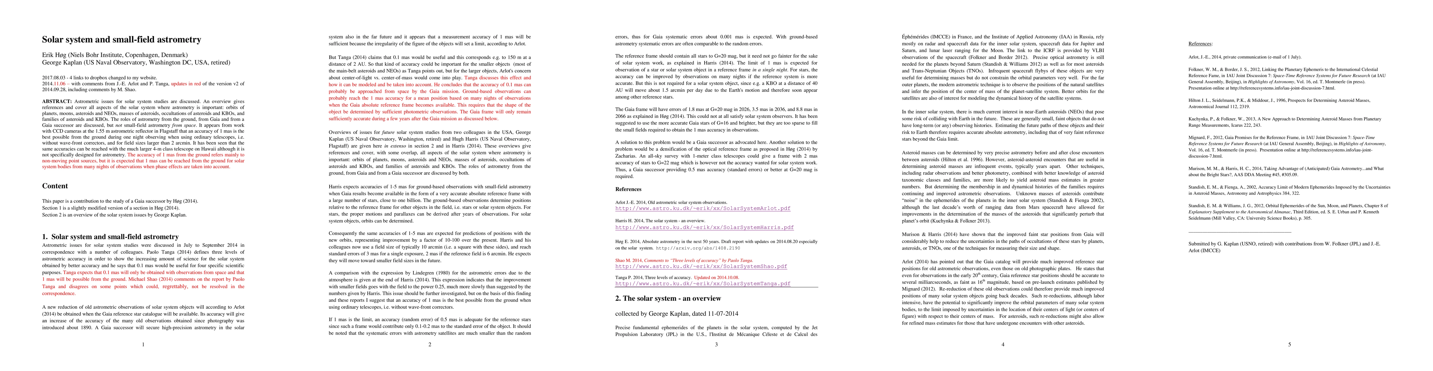 Astrometric issues for solar system studies are discussed. An overview gives references and cover all aspects of the solar system where astrometry is important: orbits of planets, moons, asteroids and NEOs, masses of asteroids, occultations of asteroids and KBOs, and families of asteroids and KBOs. The roles of astrometry from the ground, from Gaia and from a Gaia successor are discussed, but not small-field astrometry from space. It appears from work with CCD cameras at the 1.55 m astrometric reflector in Flagstaff that an accuracy of 1 mas is the best possible from the ground during one night observing when using ordinary telescopes, i.e. without wave-front correctors, and for field sizes larger than 2 arcmin. It has been seen that the same accuracies can be reached with the much larger 4-m class telescope on Hawaii although it is not specifically designed for astrometry. The accuracy of 1 mas from the ground refers mainly to non-moving point sources, but it is expected that 1 mas can be reached from the ground for solar system bodies from many nights of observations when phase effects are taken into account.
