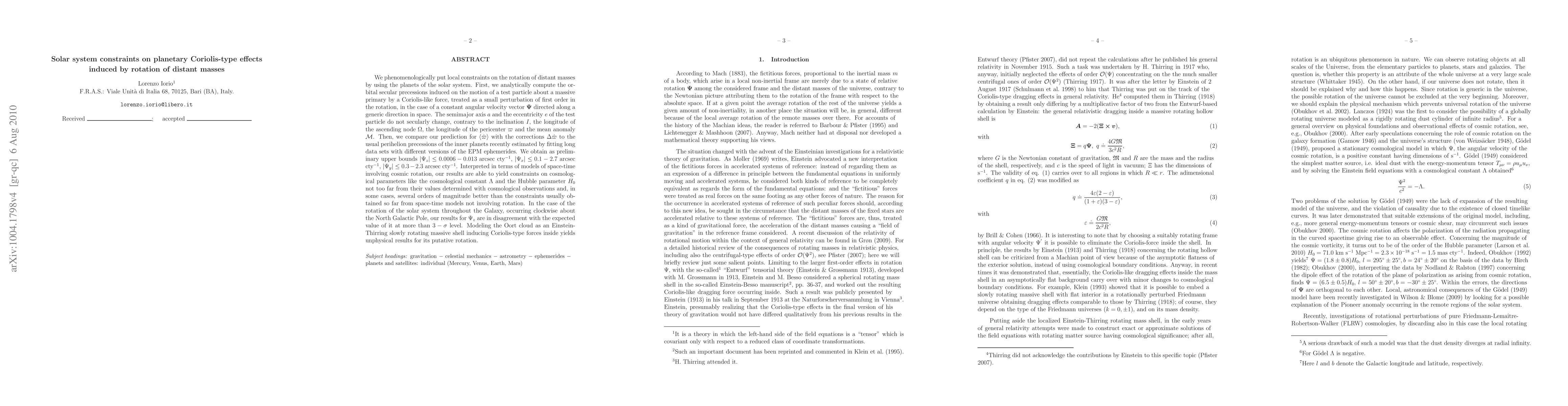 We phenomenologically put local constraints on the rotation of distant masses by using the planets of the solar system. First, we analytically compute the orbital secular precessions induced on the motion of a test particle about a massive primary by a Coriolis-like force, treated as a small perturbation of first order in the rotation, in the case of a constant angular velocity vector \Psi directed along a generic direction in space. The semimajor axis a and the eccentricity e of the test particle do not secularly precess, contrary to the inclination I, the longitude of the ascending node \Omega, the longitude of the pericenter \varpi and the mean anomaly M. Then, we compare our prediction for <\dot\varpi> with the corrections \Delta\dot\varpi to the usual perihelion precessions of the inner planets recently estimated by fitting long data sets with different versions of the EPM ephemerides. We obtain |\Psi_z| <= 0.0006-0.013 arcsec cty^-1, |\Psi_x| <= 0.1-2.7 arcsec cty-1, |\Psi_y| <= 0.3-2.3 arcsec cty^-1. Interpreted in terms of models of space-time involving cosmic rotation, our results are able to yield constraints on cosmological parameters like the cosmological constant \Lambda and the Hubble parameter H_0 not too far from their values determined with cosmological observations and, in some cases, several orders of magnitude better than the constraints usually obtained so far from space-time models not involving rotation. In the case of the rotation of the solar system throughout the Galaxy, occurring clockwise about the North Galactic Pole, our results for \Psi_z are in disagreement with the expected value of it at more than 3-\sigma level.