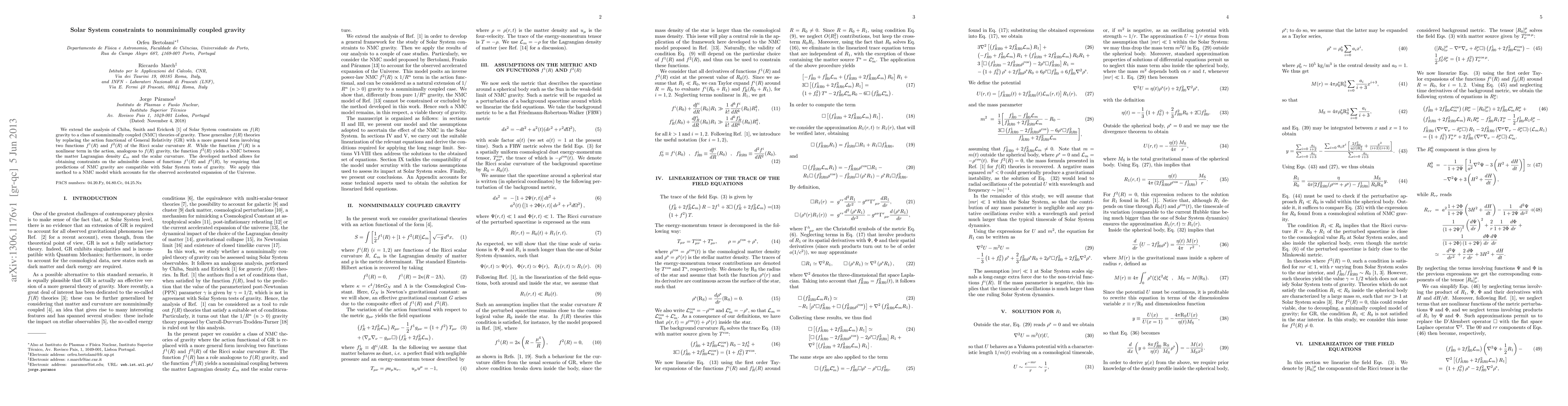 This paper extends the analysis of Solar System constraints on $f(R)$ gravity to nonminimally coupled (NMC) theories, introducing two functions $f^1(R)$ and $f^2(R)$ to generalize $f(R)$ gravity. It develops a method to constrain these functions to ensure compatibility with Solar System tests, applying it to a NMC model explaining the observed accelerated expansion of the Universe.