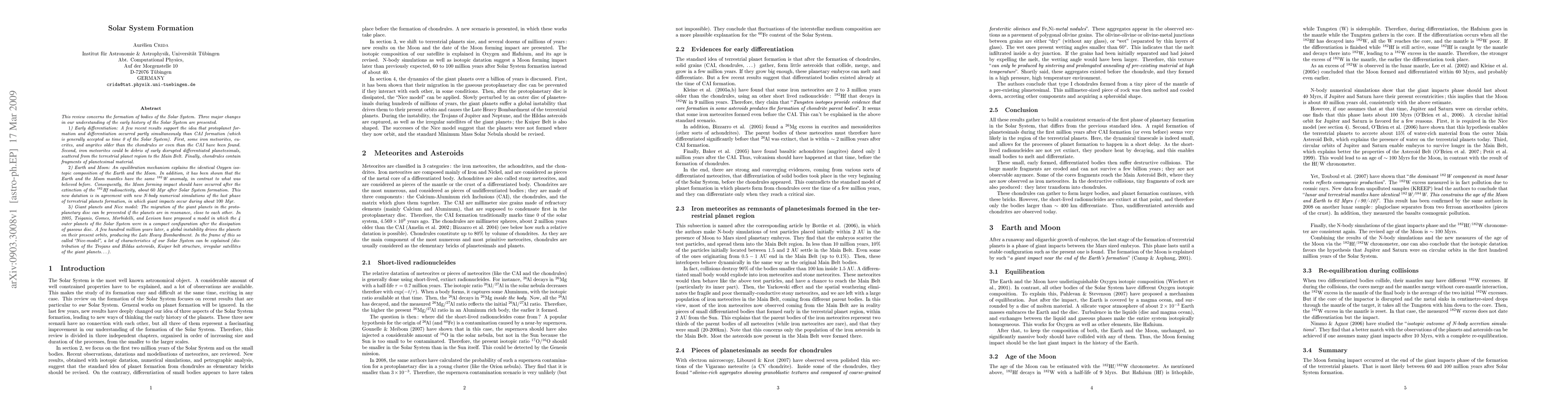 In this review, three major changes in our understanding of the early history of the Solar System are presented. 1) Early differentiation: A few recent results support the idea that protoplanet formation and differentiation occurred partly simultaneously than CAI formation. First, some iron meteorites, eucrites, and angrites older than the chondrules or even than the CAI have been found. Second, iron meteorites could be debris of early disrupted differentiated planetesimals, scattered from the terrestrial planet region to the Main Belt. Finally, chondrules contain fragments of planetesimal material. 2) Earth and Moon: An equilibration mechanism explains the identical Oxygen isotopic composition of the Earth and the Moon. In addition, it has been shown that the Earth and the Moon mantles have the same 182^W anomaly, in contrast to what was believed before. Consequently, the Moon forming impact should have occurred after the extinction of the 182Hf radioactivity, about 60 Myr after Solar System formation. This new datation is in agreement with new N-body numerical simulations of the last phase of terrestrial planets formation, in which giant impacts occur during about 100 Myr. 3) Giant planets and Nice model: The migration of the giant planets in the protoplanetary disc can be prevented if the planets are in resonance, close to each other. In the ``Nice model'', the 4 outer planets of the Solar System were in a compact configuration after the dissipation of gaseous disc. A few hundred million years later, a global instability drives the planets on their present orbits, producing the Late Heavy Bombardment. In this frame, a lot of characteristics of our Solar System can be explained.