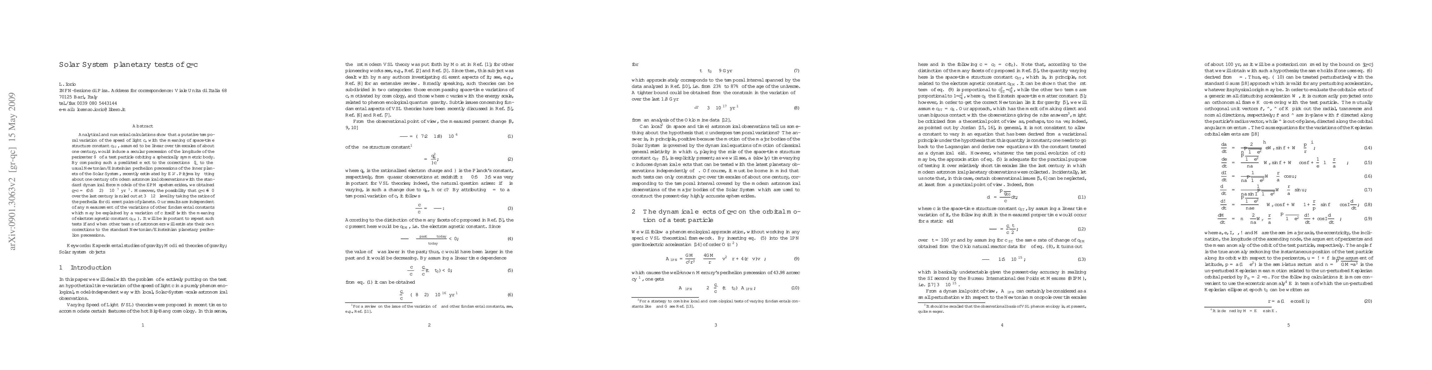 Analytical and numerical calculations show that a putative temporal variation of the speed of light c, with the meaning of space-time structure constant c_ST, assumed to be linear over timescales of about one century, would induce a secular precession of the longitude of the pericenter \varpi of a test particle orbiting a spherically symmetric body. By comparing such a predicted effect to the corrections \Delta\dot\varpi to the usual Newtonian/Einsteinian perihelion precessions of the inner planets of the Solar System, recently estimated by E.V. Pitjeva by fitting about one century of modern astronomical observations with the standard dynamical force models of the EPM epehemerides, we obtained \dot c/c =(0.5 +/- 2)\times 10^-7 yr^-1. Moreover, the possibility that \dot c/c\neq 0 over the last century is ruled out at 3-12\sigma level by taking the ratios of the perihelia for different pairs of planets. Our results are independent of any measurement of the variations of other fundamental constants which may be explained by a variation of $c$ itself (with the meaning of electromagnetic constant c_EM). It will be important to repeat such tests if and when other teams of astronomers will estimate their own corrections to the standard Newtonian/Einsteinian planetary perihelion precessions.