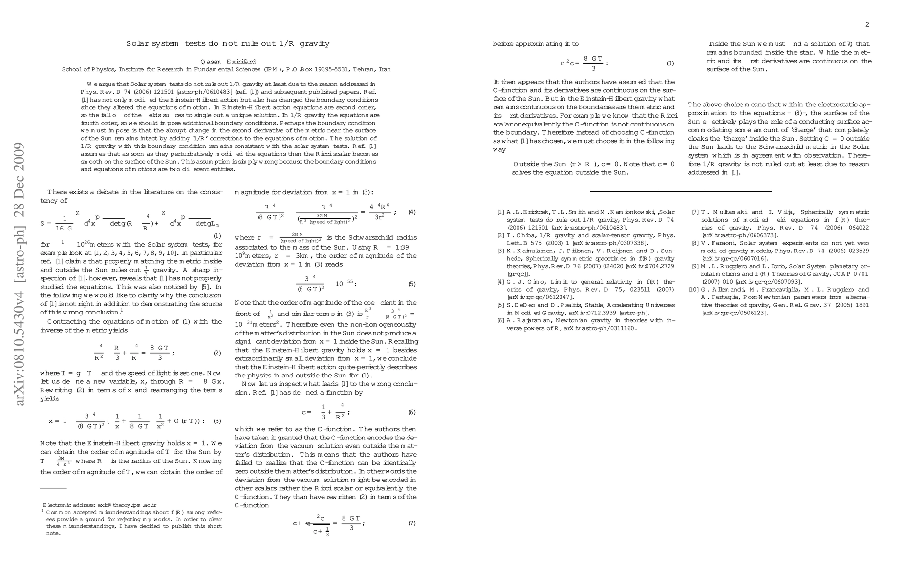 We argue that Solar system tests do not rule out 1/R gravity at least due to the reason addressed in Phys. Rev. D 74 (2006) 121501 [astro-ph/0610483] (ref. [1]) and subsequent published papers. Ref. [1] has not only modified the Einstein-Hilbert action but also has changed the boundary conditions since they altered the equations of motion. In Einstein-Hilbert action equations are second order, so the fall off of the fields suffices to single out a unique solution. In 1/R gravity the equations are fourth order, so we should impose additional boundary conditions. Perhaps the boundary condition we must impose is that the abrupt change in the second derivative of the metric near the surface of the Sun remains intact by adding `1/R' corrections to the equations of motion. The solution of 1/R gravity with this boundary condition remains consistent with the solar system tests. Ref. [1] assumes that as soon as they perturbatively modified the equations then the Ricci scalar becomes smooth on the surface of the Sun. This assumption is simply wrong because the boundary conditions and equations of motions are two different entities.