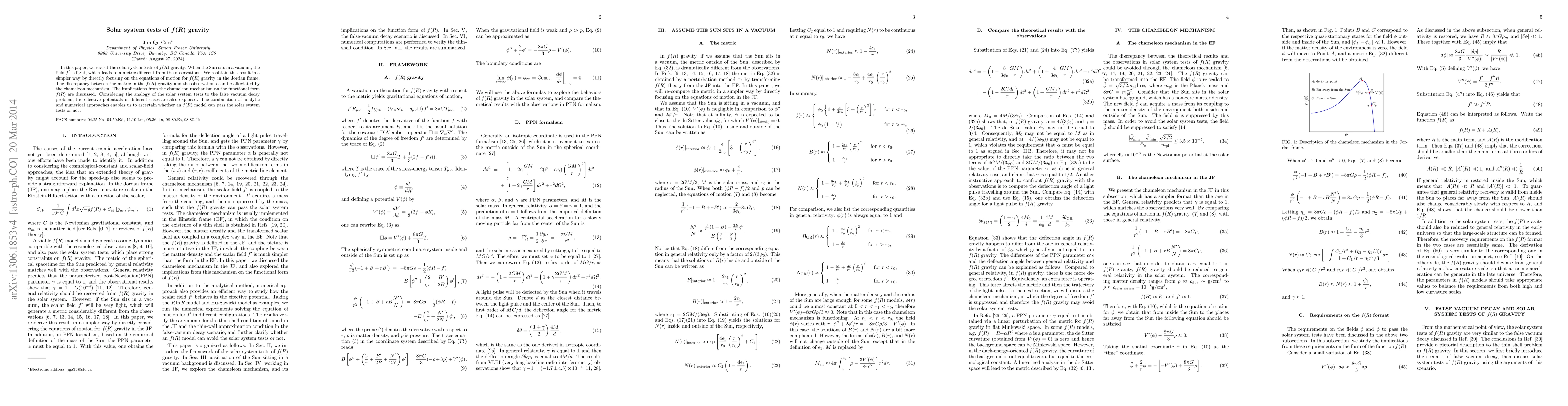 In this paper, we revisit the solar system tests of f(R) gravity. When the Sun sits in a vacuum, the field f' is light, which leads to a metric different from the observations. We reobtain this result in a simpler way by directly focusing on the equations of motion for f(R) gravity in the Jordan frame. The discrepancy between the metric in the f(R) gravity and the observations can be alleviated by the chameleon mechanism. The implications from the chameleon mechanism on the functional form f(R) are discussed. Considering the analogy of the solar system tests to the false vacuum decay problem, the effective potentials in different cases are also explored. The combination of analytic and numerical approaches enables us to ascertain whether an f(R) model can pass the solar system tests or not.