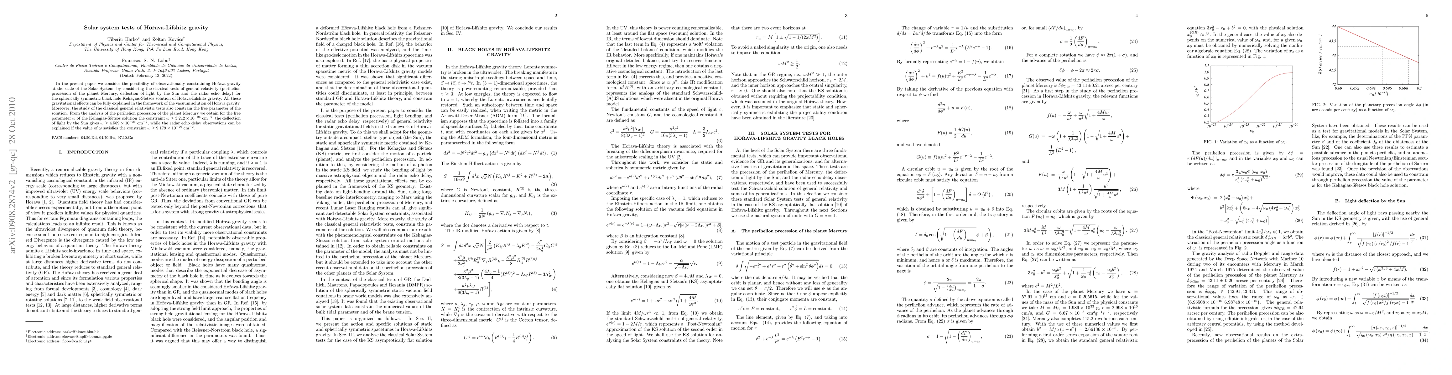This paper examines the feasibility of testing Hořava-Lifshitz gravity using classical Solar System tests of general relativity, including Mercury's perihelion precession, light deflection by the Sun, and radar echo delay. The results suggest that Hořava gravity can explain these effects while constraining its free parameter.