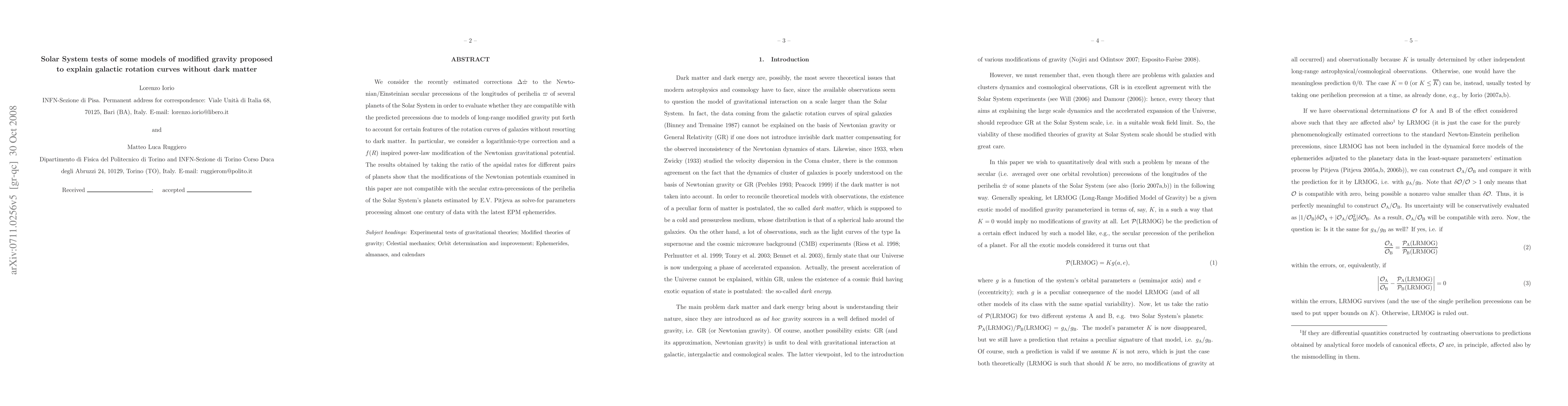 Studies of Solar System planets' perihelia precessions show that modified gravity models incompatible with Pitjeva's estimates, suggesting dark matter is still necessary for accurate predictions.
