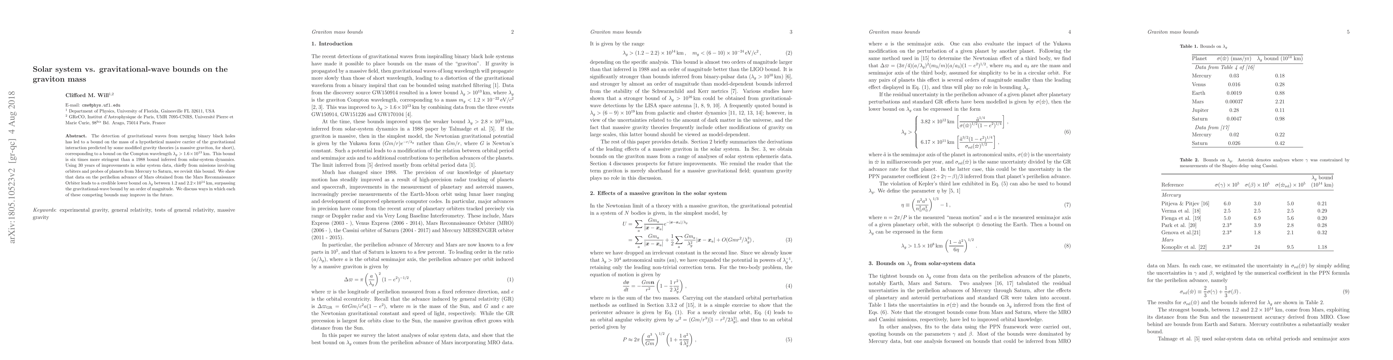 This paper compares the gravitational-wave bound on the mass of a massive graviton from recent detections to the solar-system bound derived from 30 years of improved planetary data. The new solar-system bound, particularly from Mars' perihelion advance, surpasses the gravitational-wave bound by an order of magnitude.
