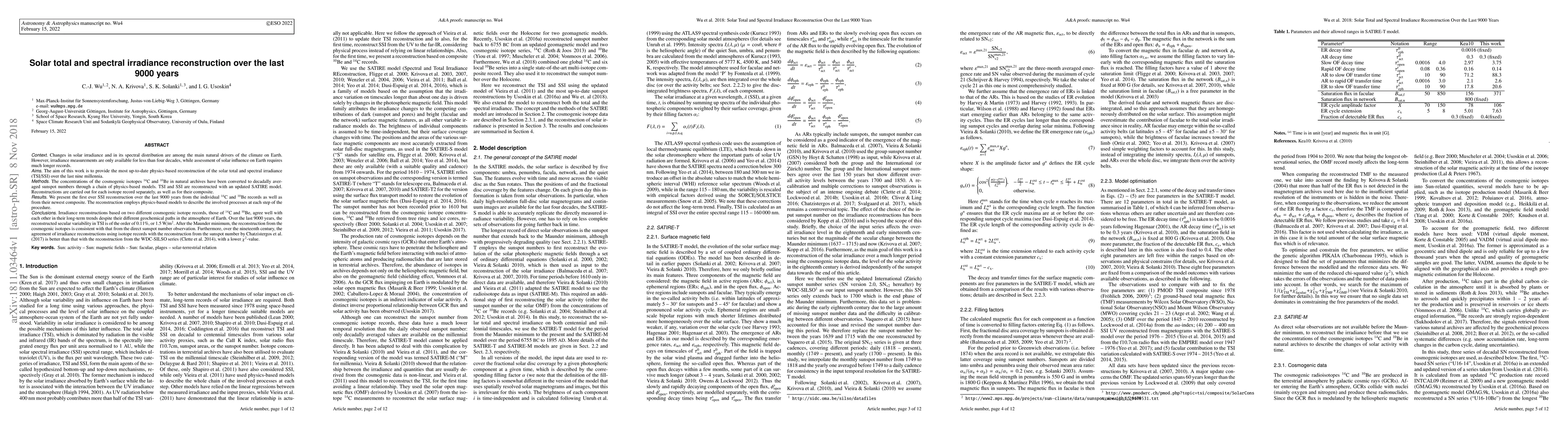 This paper reconstructs solar total and spectral irradiance over the last 9000 years using physics-based models and cosmogenic isotopes 14C and 10Be. The study finds good agreement between reconstructions from these isotopes and provides the first spectral irradiance reconstruction over this period, revealing a secular variability of 0.11% or 1.5 W/m2.