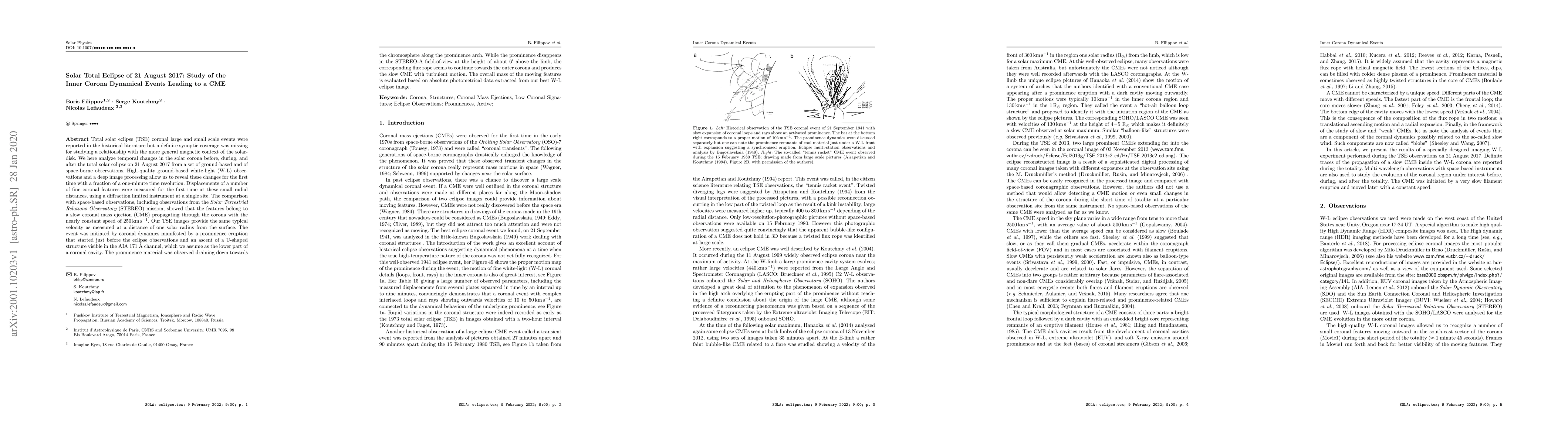 Total solar eclipse (TSE) coronal large and small scale events were reported in the historical literature but a definite synoptic coverage was missing for studying a relationship with the more general magnetic context of the solar-disk. We here analyze temporal changes in the solar corona before, during, and after the total solar eclipse on 21 August 2017 from a set of ground-based and of space-borne observations. High-quality ground-based white-light (W-L) observations and a deep image processing allow us to reveal these changes for the first time with a fraction of a one-minute time resolution. Displacements of a number of fine coronal features were measured for the first time at these small radial distances, using a diffraction limited instrument at a single site. The comparison with space-based observations, including observations from the {\it Solar Terrestrial Relations Observatory} (STEREO) mission, showed that the features belong to a slow coronal mass ejection (CME) propagating through the corona with the nearly constant speed of 250 km/s. Our TSE images provide the same typical velocity as measured at a distance of one solar radius from the surface. The event was initiated by coronal dynamics manifested by a prominence eruption that started just before the eclipse observations and an ascent of a U-shaped structure visible in the AIA 171 A channel, which we assume as the lower part of a coronal cavity. The prominence material was observed draining down towards the chromosphere along the prominence arch. While the prominence disappears in the STEREO-A field-of-view at the height of about 6$^{\prime}$ above the limb, the corresponding flux rope seems to continue towards the outer corona and produces the slow CME with turbulent motion. The overall mass of the moving features is evaluated based on absolute photometrical data extracted from our best W-L eclipse image.