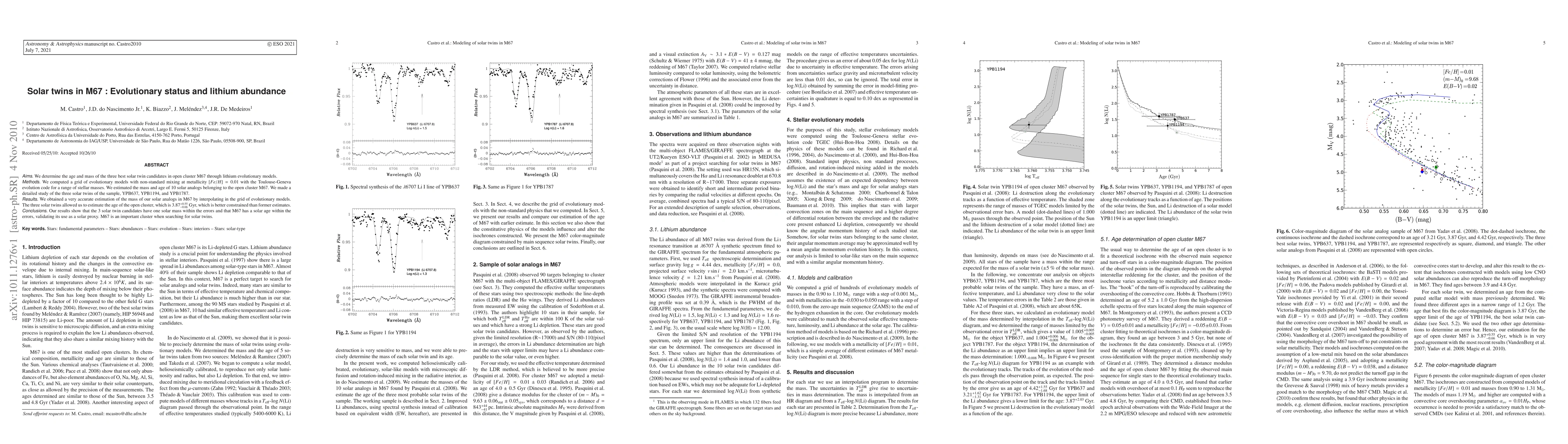 This paper estimates the age and mass of three solar twin candidates in the M67 open cluster using evolutionary models, determining the cluster's age to be 3.87+0.55-0.66 Gyr, and confirming the solar twins' mass and the cluster's relevance for solar analog studies.