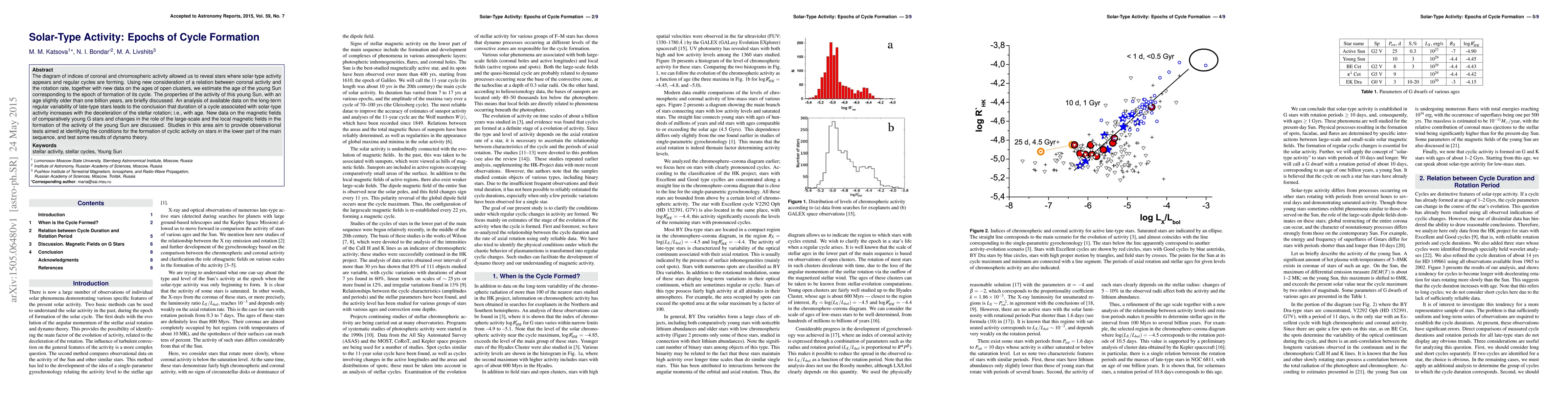 The diagram of indices of coronal and chromospheric activity allowed us to reveal stars where solar-type activity appears and regular cycles are forming. Using new consideration of a relation between coronal activity and the rotation rate, together with new data on the ages of open clusters, we estimate the age of the young Sun corresponding to the epoch of formation of its cycle. The properties of the activity of this young Sun, with an age slightly older than one billion years, are briefly discussed. An analysis of available data on the long-term regular variability of late-type stars leads to the conclusion that duration of a cycle associated with solar-type activity increases with the deceleration of the stellar rotation; i.e., with age. New data on the magnetic fields of comparatively young G stars and changes in the role of the large-scale and the local magnetic fields in the formation of the activity of the young Sun are discussed. Studies in this area aim to provide observational tests aimed at identifying the conditions for the formation of cyclic activity on stars in the lower part of the main sequence, and test some results of dynamo theory.