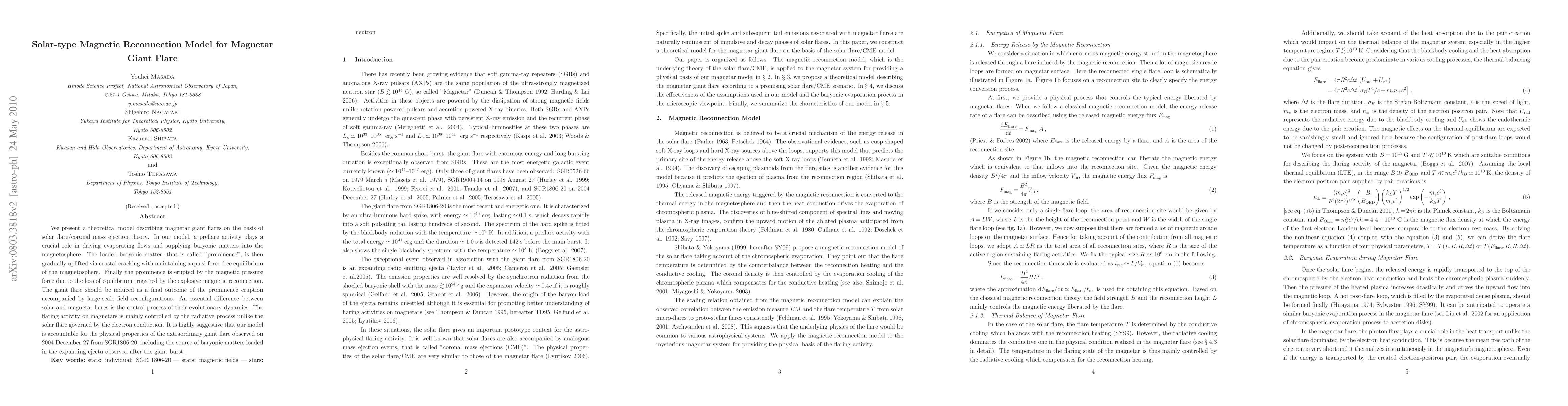 We present a theoretical model describing magnetar giant flares on the basis of solar flare/coronal mass ejection theory. In our model, a preflare activity plays a crucial role in driving evaporating flows and supplying baryonic matters into the magnetosphere. The loaded baryonic matter, that is called "prominence", is then gradually uplifted via crustal cracking with maintaining a quasi-force-free equilibrium of the magnetosphere. Finally the prominence is erupted by the magnetic pressure force due to the loss of equilibrium triggered by the explosive magnetic reconnection. The giant flare should be induced as a final outcome of the prominence eruption accompanied by large-scale field reconfigurations. An essential difference between solar and magnetar flares is the control process of their evolutionary dynamics. The flaring activity on magnetars is mainly controlled by the radiative process unlike the solar flare governed by the electron conduction. It is highly suggestive that our model is accountable for the physical properties of the extraordinary giant flare observed on 2004 December 27 from SGR1806-20, including the source of baryonic matters loaded in the expanding ejecta observed after the giant burst.