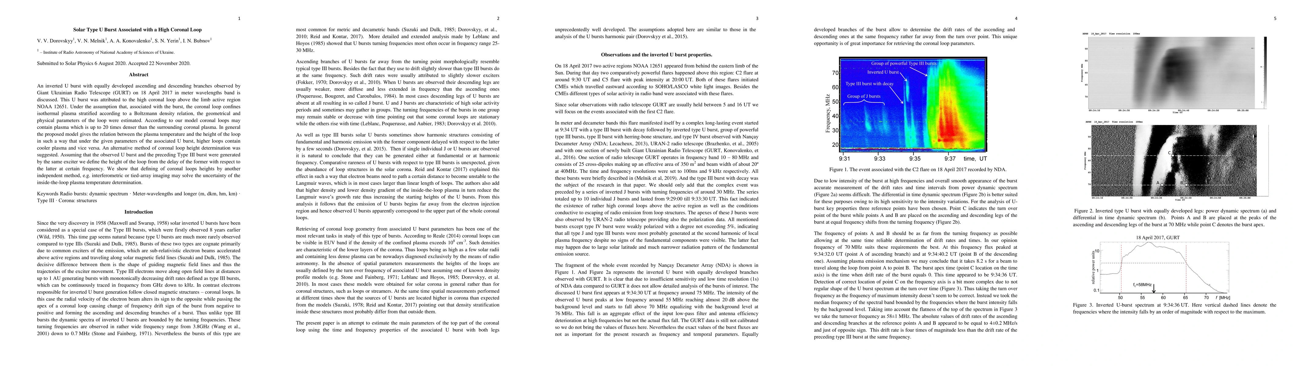 This paper discusses a solar U burst observed by GURT, attributing it to a high coronal loop above an active region. The study estimates the loop's geometrical and physical parameters, suggesting plasma density up to 20 times denser than surrounding coronal plasma, and proposes a method to determine loop heights using burst delays.