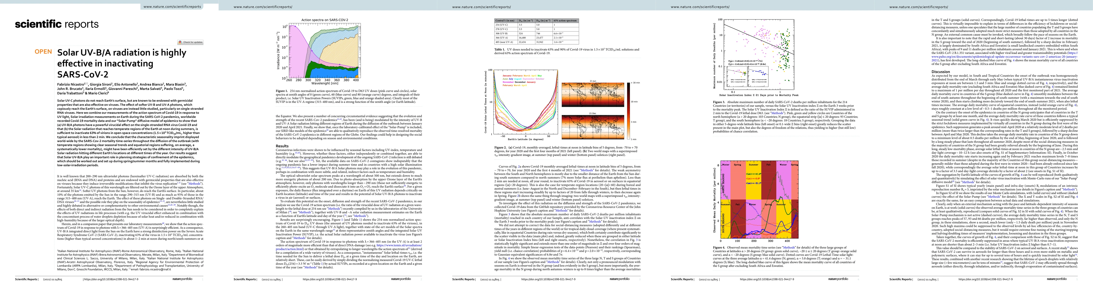 Solar UV$-$C photons do not reach Earth's surface, but are known to be endowed with germicidal properties that are also effective on viruses. The effect of softer UV$-$B and UV$-$A photons, which copiously reach the Earth's surface, on viruses are instead little studied, particularly on single$-$stranded RNA viruses. Here we combine our measurements of the action spectrum of Covid$-$19 in response to UV light, Solar irradiation measurements on Earth during the SARS$-$CoV$-$2 pandemics, worldwide recorded Covid$-$19 mortality data and our 'Solar$-$Pump' diffusive model of epidemics to show that (a) UV$-$B$/$A photons have a powerful virucidal effect on the single$-$stranded RNA virus Covid$-$19 and that (b) the Solar radiation that reaches temperate regions of the Earth at noon during summers, is sufficient to inactivate 63\perc of virions in open$-$space concentrations (1.5 x 103 TCID50$/$mL, higher than typical aerosol) in less than 2 min. We conclude that the characteristic seasonality imprint displayed world$-$wide by the SARS$-$Cov$-$2 mortality time$-$series throughout the diffusion of the outbreak (with temperate regions showing clear seasonal trends and equatorial regions suffering, on average, a systematically lower mortality), might have been efficiently set by the different intensity of UV$-$B$/$A Solar radiation hitting different Earth's locations at different times of the year. Our results suggest that Solar UV$-$B$/$A play an important role in planning strategies of confinement of the epidemics, which should be worked out and set up during spring$/$summer months and fully implemented during low$-$solar$-$irradiation periods.