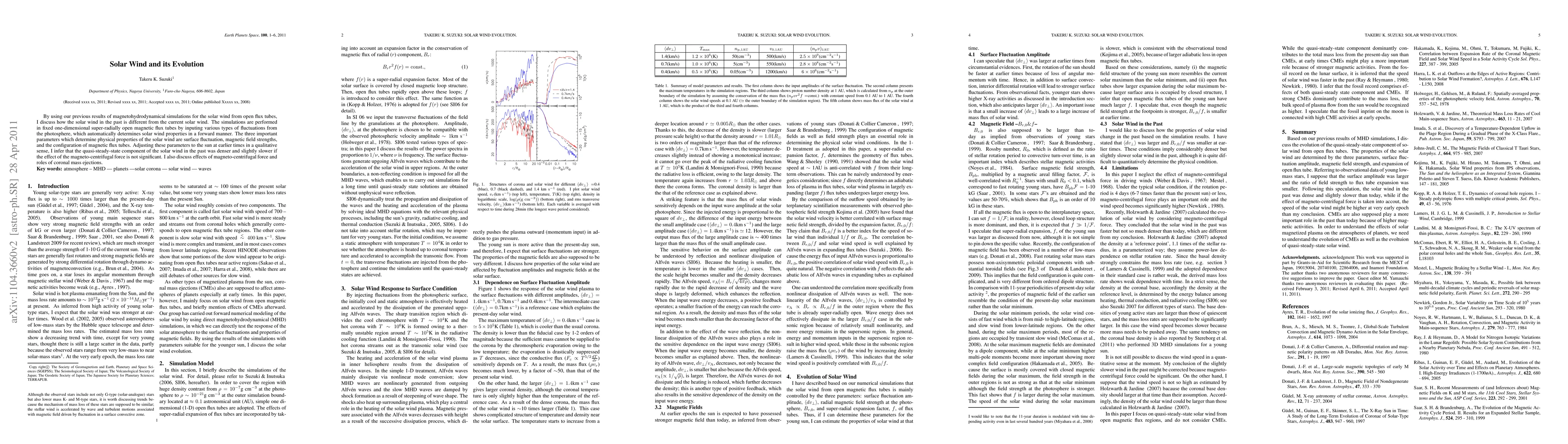 By using our previous results of magnetohydrodynamical simulations for the solar wind from open flux tubes, I discuss how the solar wind in the past is different from the current solar wind. The simulations are performed in fixed one-dimensional super-radially open magnetic flux tubes by inputing various types of fluctuations from the photosphere, which automatically determines solar wind properties in a forward manner. The three important parameters which determine physical properties of the solar wind are surface fluctuation, magnetic field strengths, and the configuration of magnetic flux tubes. Adjusting these parameters to the sun at earlier times in a qualitative sense, I infer that the quasi-steady-state component of the solar wind in the past was denser and slightly slower if the effect of the magneto-centrifugal force is not significant. I also discuss effects of magneto-centrifugal force and roles of coronal mass ejections.