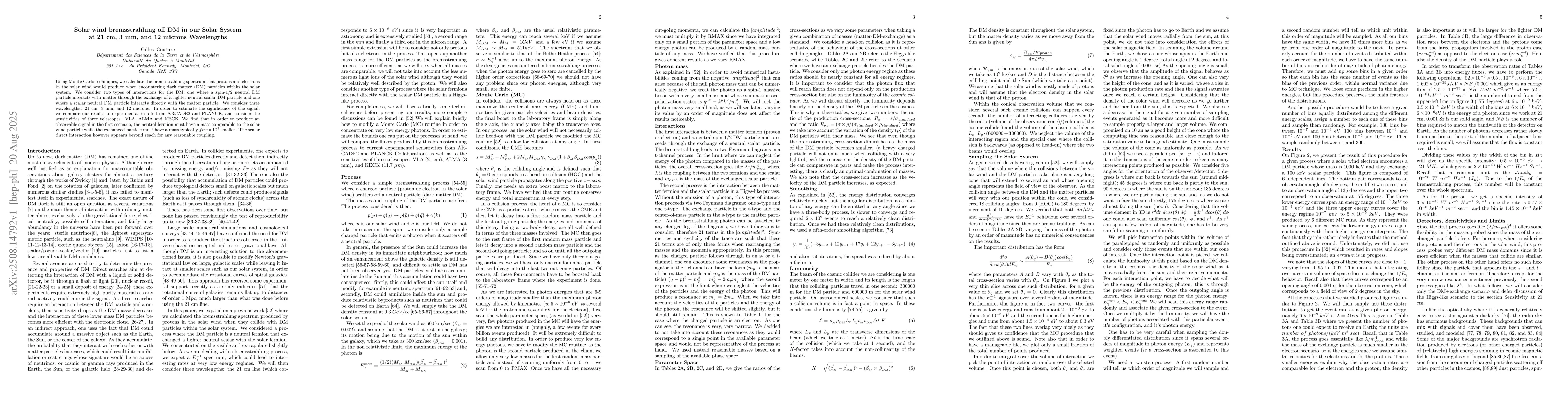 The paper presents a detailed analysis of bremsstrahlung radiation from solar wind particles interacting with dark matter, applying Monte Carlo methods to estimate signal strengths across various wavelengths and interaction models.