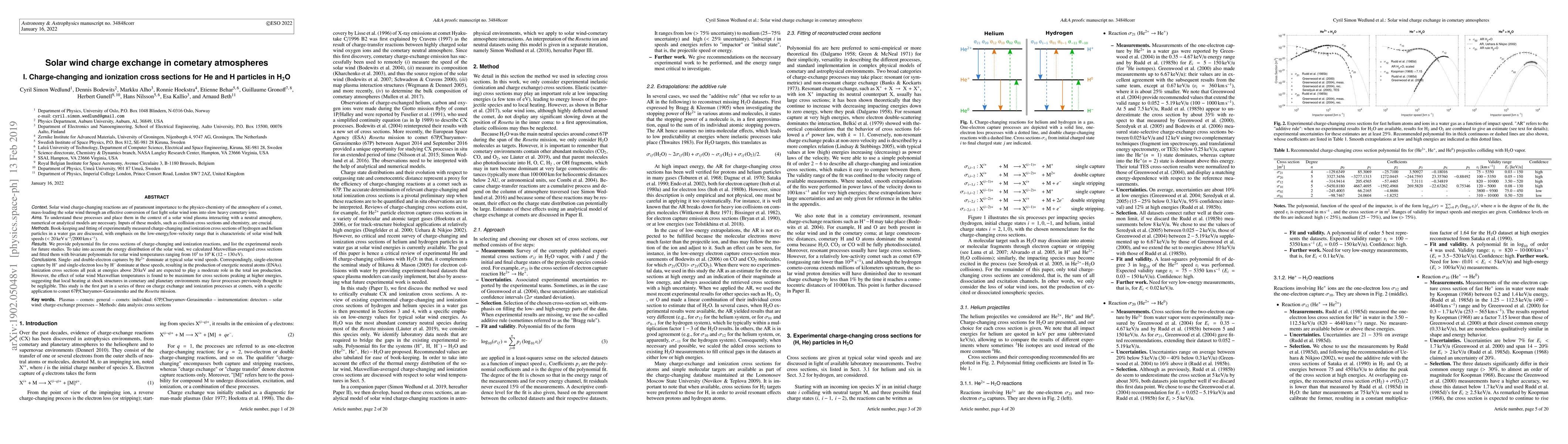 This paper investigates solar wind charge-changing reactions in cometary atmospheres, focusing on the cross sections for He and H particles in H$_2$O. It provides polynomial fits for these cross sections and highlights the importance of low-energy interactions in the solar wind, emphasizing the production of energetic neutral atoms.