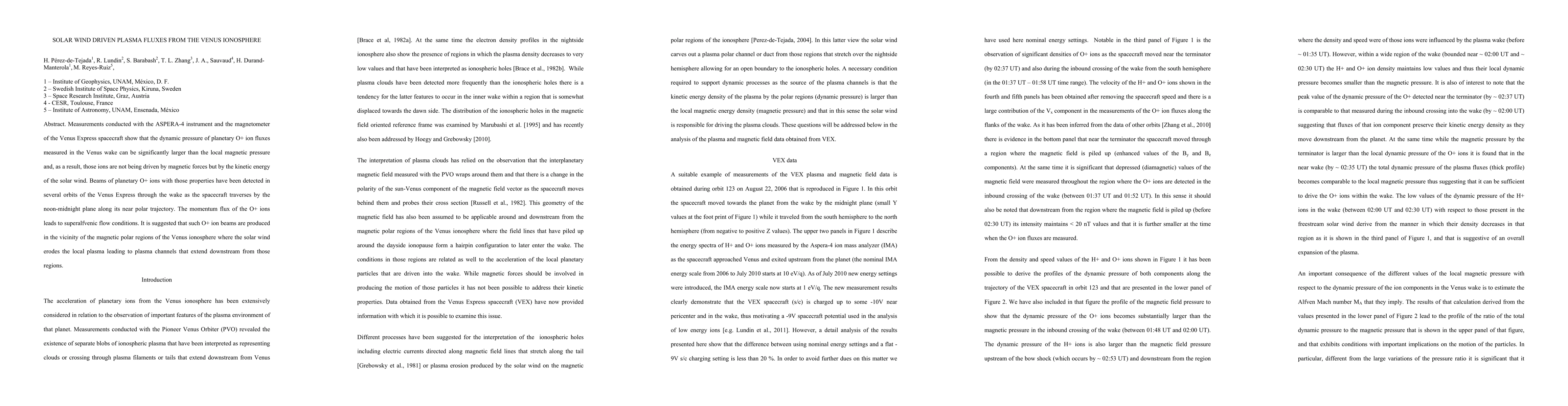 The Venus Express spacecraft detected significant O+ ion fluxes in Venus' wake driven by solar wind kinetic energy rather than magnetic forces, leading to superalfvenic flow conditions. These ion beams likely originate from magnetic polar regions where the solar wind erodes the local plasma, creating downstream plasma channels.