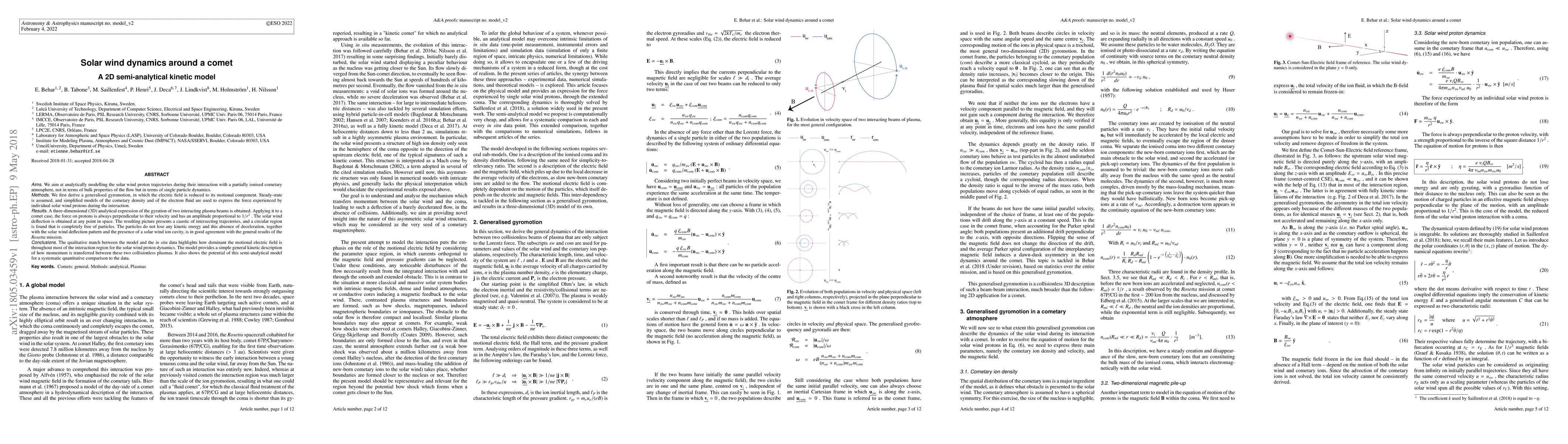 We aim at analytically modelling the solar wind proton trajectories during their interaction with a partially ionised cometary atmosphere, not in terms of bulk properties of the flow but in terms of single particle dynamics. We first derive a generalised gyromotion, in which the electric field is reduced to its motional component. Steady-state is assumed, and simplified models of the cometary density and of the electron fluid are used to express the force experienced by individual solar wind protons during the interaction. A three-dimensional (3D) analytical expression of the gyration of two interacting plasma beams is obtained. Applying it to a comet case, the force on protons is always perpendicular to their velocity and has an amplitude proportional to 1/r^2. The solar wind deflection is obtained at any point in space. The resulting picture presents a caustic of intersecting trajectories, and a circular region is found that is completely free of particles. The particles do not lose any kinetic energy and this absence of deceleration, together with the solar wind deflection pattern and the presence of a solar wind ion cavity, is in good agreement with the general results of the Rosetta mission. The qualitative match between the model and the in situ data highlights how dominant the motional electric field is throughout most of the interaction region for the solar wind proton dynamics. The model provides a simple general kinetic description of how momentum is transferred between these two collisionless plasmas. It also shows the potential of this semi-analytical model for a systematic quantitative comparison to the data.