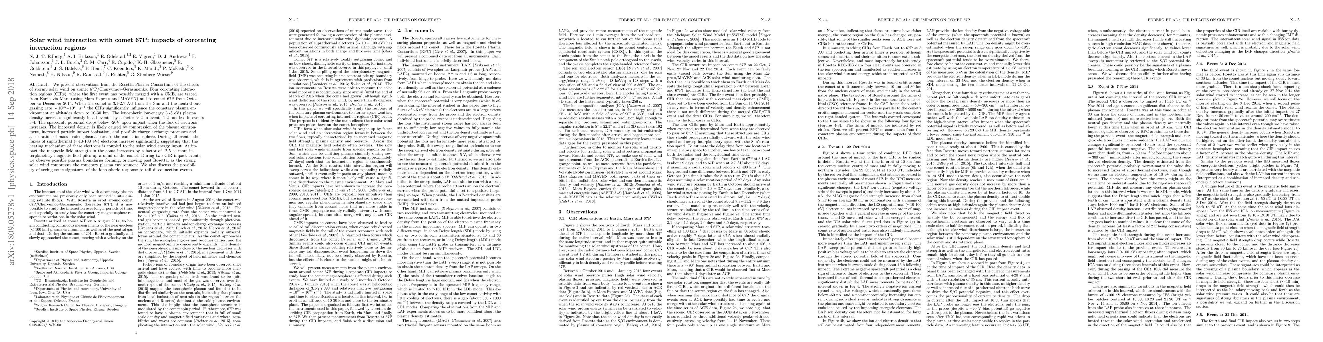 This study observes the effects of corotating interaction regions (CIRs) on comet 67P/Churyumov-Gerasimenko, noting significant changes in plasma density and electron flux, likely due to solar wind compression and increased ionization. The spacecraft potential drops, and magnetic field strength in the coma increases, indicating a strong solar wind influence on the cometary environment.