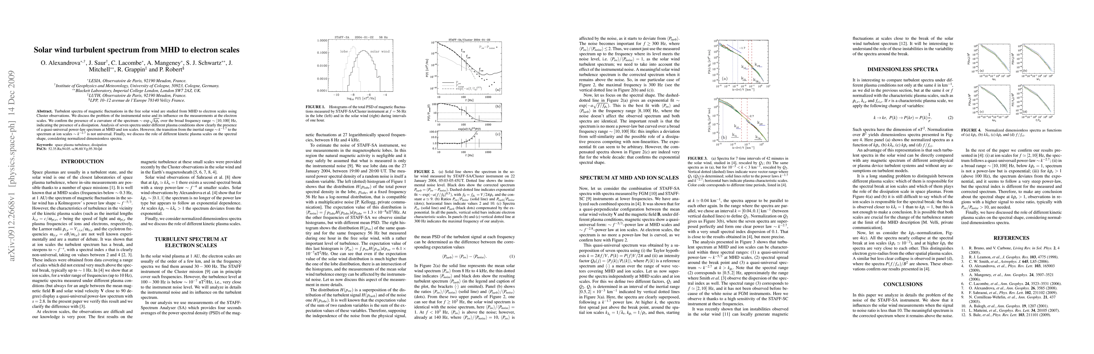 This paper investigates the turbulent magnetic fluctuations in the solar wind from MHD to electron scales using Cluster observations, confirming a quasi-universal power-law spectrum at MHD and ion scales but noting a non-universal transition to the electron scale. It also discusses the influence of instrumental noise and the presence of dissipation indicated by a spectrum curvature.