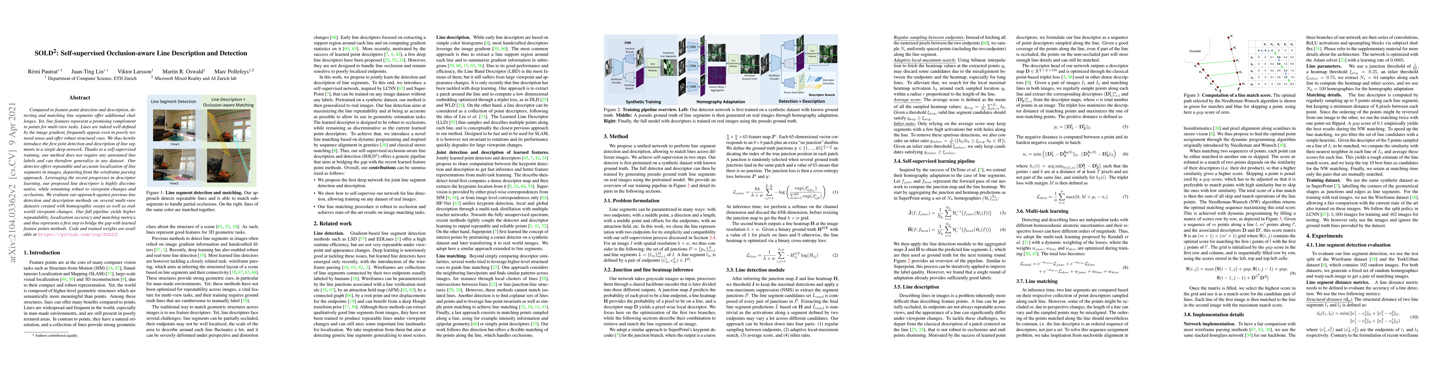 Compared to feature point detection and description, detecting and matching line segments offer additional challenges. Yet, line features represent a promising complement to points for multi-view tasks. Lines are indeed well-defined by the image gradient, frequently appear even in poorly textured areas and offer robust structural cues. We thus hereby introduce the first joint detection and description of line segments in a single deep network. Thanks to a self-supervised training, our method does not require any annotated line labels and can therefore generalize to any dataset. Our detector offers repeatable and accurate localization of line segments in images, departing from the wireframe parsing approach. Leveraging the recent progresses in descriptor learning, our proposed line descriptor is highly discriminative, while remaining robust to viewpoint changes and occlusions. We evaluate our approach against previous line detection and description methods on several multi-view datasets created with homographic warps as well as real-world viewpoint changes. Our full pipeline yields higher repeatability, localization accuracy and matching metrics, and thus represents a first step to bridge the gap with learned feature points methods. Code and trained weights are available at https://github.com/cvg/SOLD2.