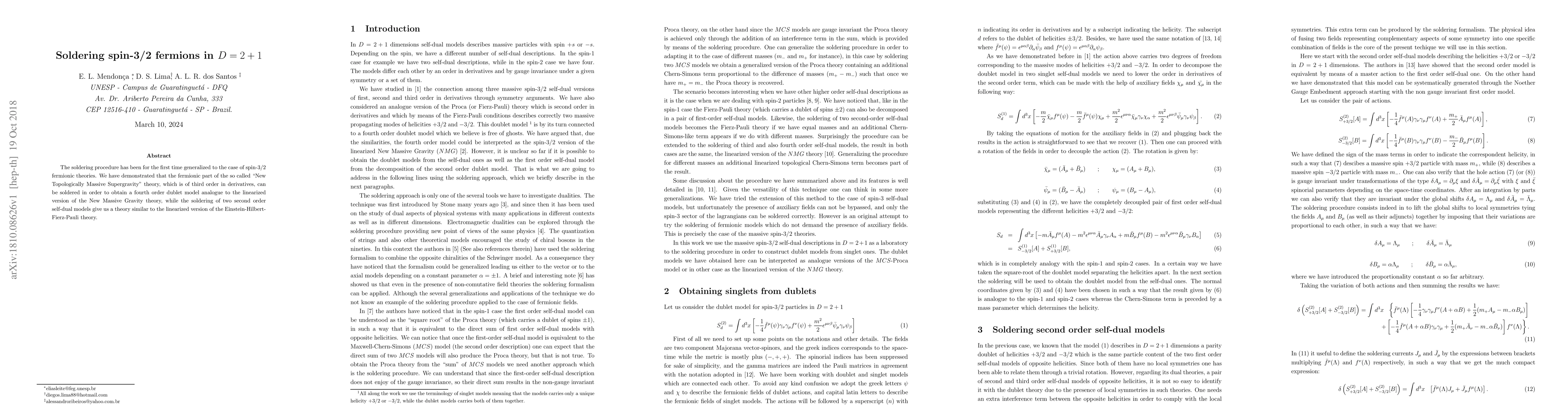 This paper generalizes the soldering procedure to spin-3/2 fermionic theories, showing that New Topologically Massive Supergravity can be transformed into a fourth-order doublet model, analogous to New Massive Gravity, and that soldering two second-order self-dual models results in a theory akin to linearized Einstein-Hilbert-Fierz-Pauli theory.