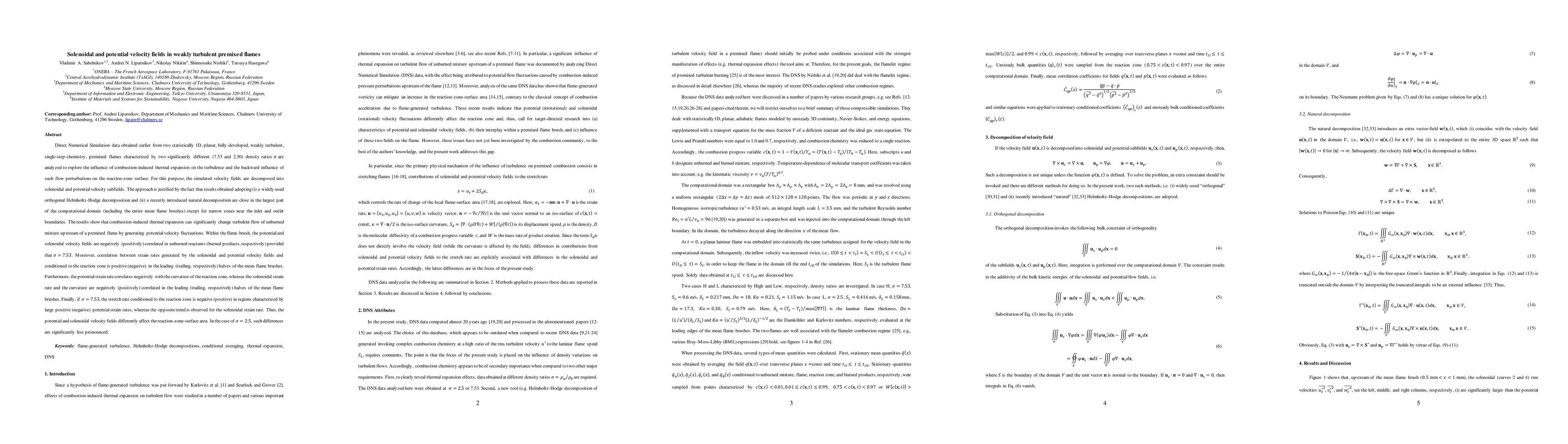 Direct Numerical Simulation data obtained earlier from two statistically 1D, planar, fully-developed, weakly turbulent, single-step-chemistry, premixed flames characterized by two significantly different (7.53 and 2.50) density ratios {\sigma} are analyzed to explore the influence of combustion-induced thermal expansion on the turbulence and the backward influence of such flow perturbations on the reaction-zone surface. For this purpose, the simulated velocity fields are decomposed into solenoidal and potential velocity subfields. The approach is justified by the fact that results obtained adopting (i) a widely used orthogonal Helmholtz-Hodge decomposition and (ii) a recently introduced natural decomposition are close in the largest part of the computational domain (including the entire mean flame brushes) except for narrow zones near the inlet and outlet boundaries. The results show that combustion-induced thermal expansion can significantly change turbulent flow of unburned mixture upstream of a premixed flame by generating potential velocity fluctuations. Within the flame brush, the potential and solenoidal velocity fields are negatively (positively) correlated in unburned reactants (burned products, respectively) provided that {\sigma}=7.53. Moreover, correlation between strain rates generated by the solenoidal and potential velocity fields and conditioned to the reaction zone is positive (negative) in the leading (trailing, respectively) halves of the mean flame brushes. Furthermore, the potential strain rate correlates negatively with the curvature of the reaction zone, whereas the solenoidal strain rate and the curvature are negatively (positively) correlated in the leading (trailing, respectively) halves of the mean flame brushes.