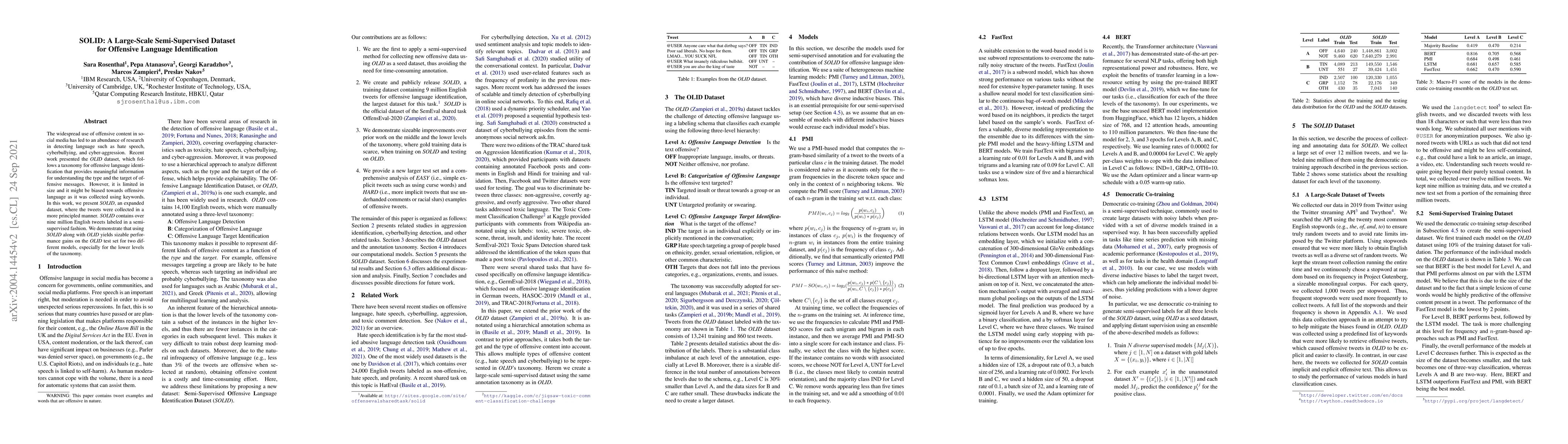 Title: SOLID: A Large-Scale Semi-Supervised Dataset for Offensive Language Identification Summary: This paper introduces SOLID, a significantly larger and more systematically collected dataset for detecting offensive language compared to the existing OLID dataset, demonstrating improved performance in offensive language detection models when used in conjunction with OLID.