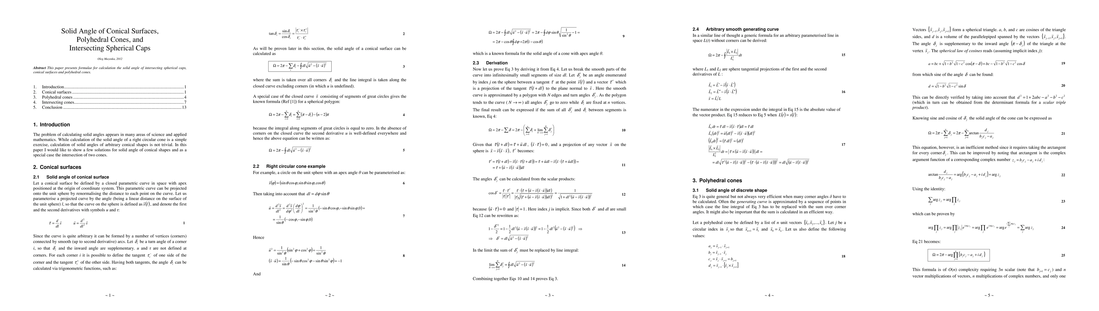 This paper derives mathematical expressions for calculating the solid angle subtended by intersecting spherical caps, conical surfaces, and polyhedral cones. The findings provide essential tools for various fields including astrophysics and computer graphics.