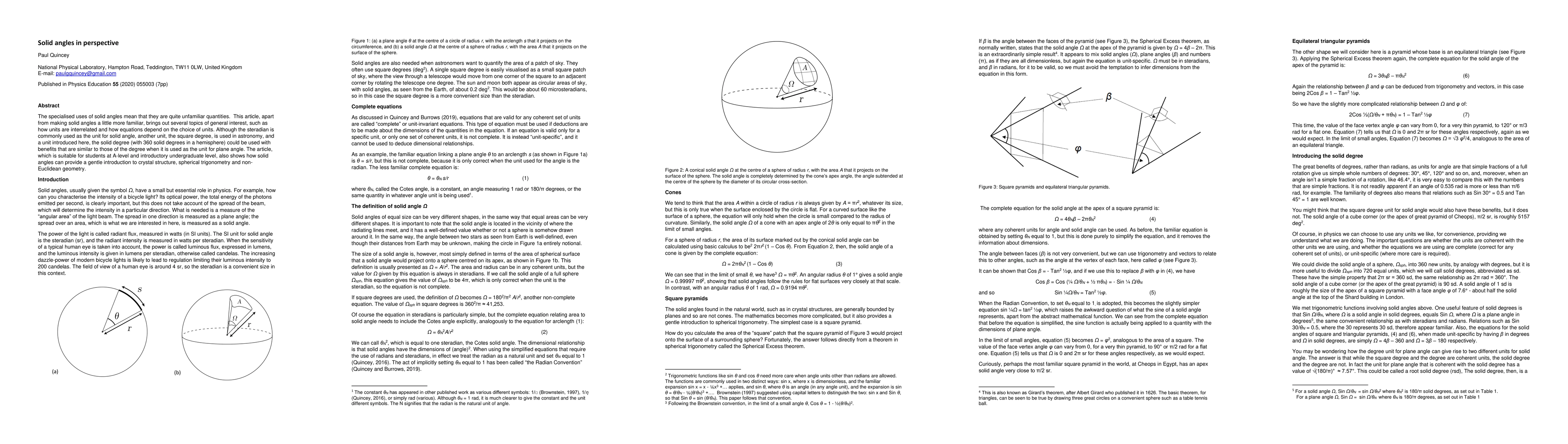 The specialised uses of solid angles mean that they are quite unfamiliar quantities. This article, apart from making solid angles a little more familiar, brings out several topics of general interest, such as how units are interrelated and how equations depend on the choice of units. Although the steradian is commonly used as the unit for solid angle, another unit, the square degree, is used in astronomy, and a unit introduced here, the solid degree (with 360 solid degrees in a hemisphere) could be used with benefits that are similar to those of the degree when it is used as the unit for plane angle. The article, which is suitable for students at A-level and introductory undergraduate level, also shows how solid angles can provide a gentle introduction to crystal structure, spherical trigonometry and non-Euclidean geometry.