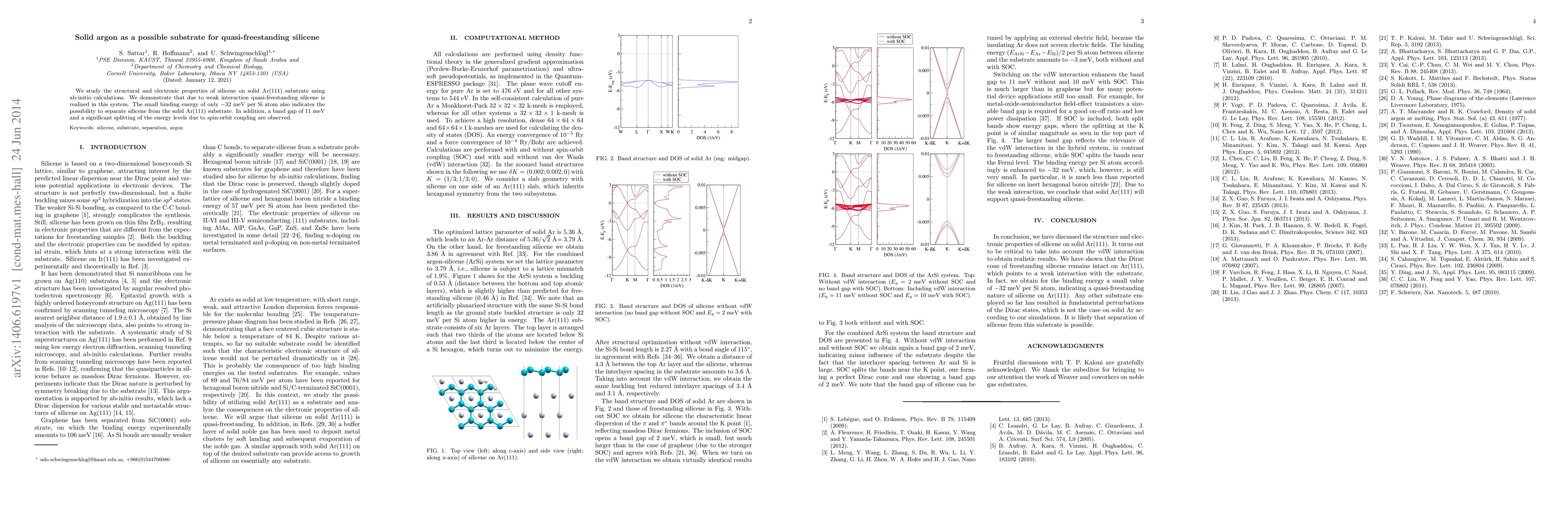 This study investigates silicene on a solid argon substrate using ab-initio calculations, revealing quasi-freestanding silicene due to its weak interaction. The small binding energy suggests potential separation, and it exhibits a band gap of 11 meV with notable energy level splitting from spin-orbit coupling.