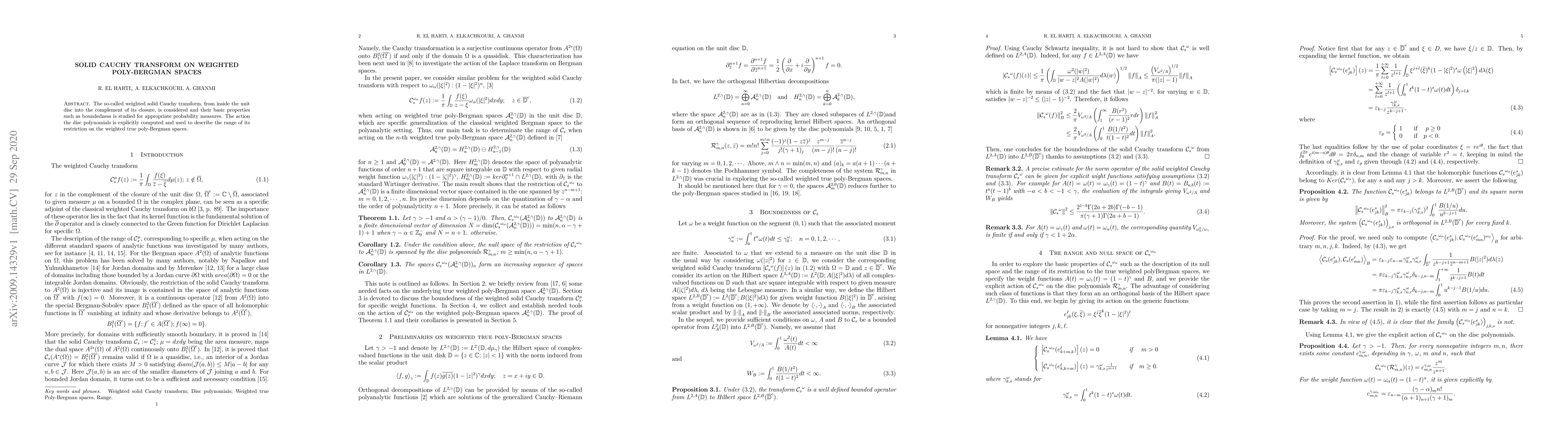 This paper investigates the weighted solid Cauchy transform's properties, focusing on boundedness for probability measures, and computes the action of disc polynomials to describe the transform's range on weighted poly-Bergman spaces.