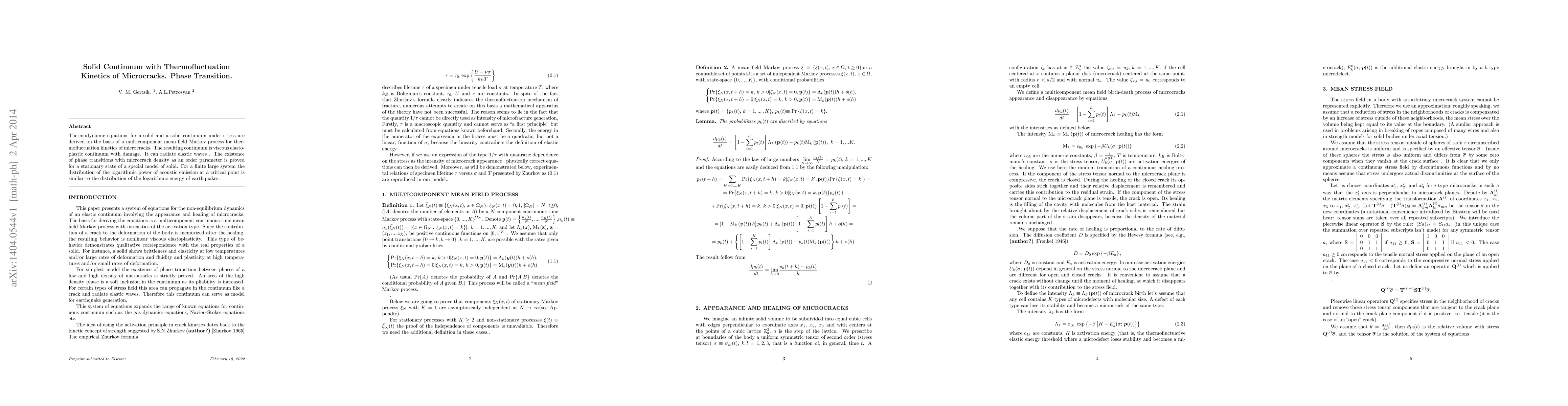 This paper derives thermodynamic equations for a solid continuum under stress using a multicomponent mean field Markov process for thermofluctuation kinetics of microcracks, resulting in a viscous elastoplastic continuum with damage. It proves the existence of phase transitions with microcrack density as an order parameter, and finds a similarity between the distribution of acoustic emission at a critical point and that of earthquake energy.