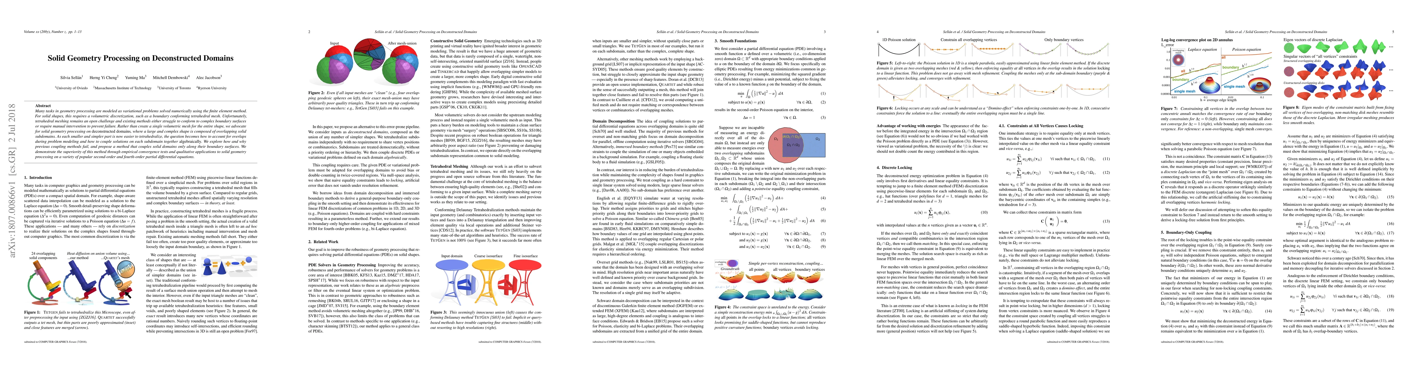 Many tasks in geometry processing are modeled as variational problems solved numerically using the finite element method. For solid shapes, this requires a volumetric discretization, such as a boundary conforming tetrahedral mesh. Unfortunately, tetrahedral meshing remains an open challenge and existing methods either struggle to conform to complex boundary surfaces or require manual intervention to prevent failure. Rather than create a single volumetric mesh for the entire shape, we advocate for solid geometry processing on deconstructed domains, where a large and complex shape is composed of overlapping solid subdomains. As each smaller and simpler part is now easier to tetrahedralize, the question becomes how to account for overlaps during problem modeling and how to couple solutions on each subdomain together algebraically. We explore how and why previous coupling methods fail, and propose a method that couples solid domains only along their boundary surfaces. We demonstrate the superiority of this method through empirical convergence tests and qualitative applications to solid geometry processing on a variety of popular second-order and fourth-order partial differential equations.
