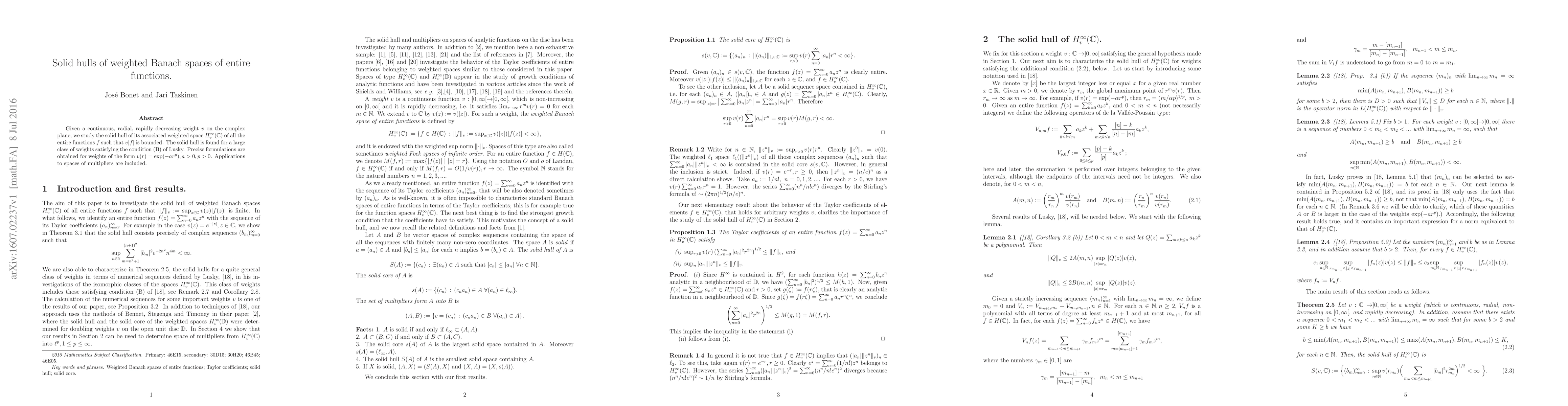 This paper investigates the solid hull of weighted Banach spaces $H_v^\infty(\mathbf{C})$ of entire functions, where $v$ is a continuous, radial, rapidly decreasing weight. It determines the solid hull for weights of the form $v(r)=\exp(-ar^p)$, $a>0, p>0$, satisfying Lusky's condition (B), and discusses applications to multiplier spaces.
